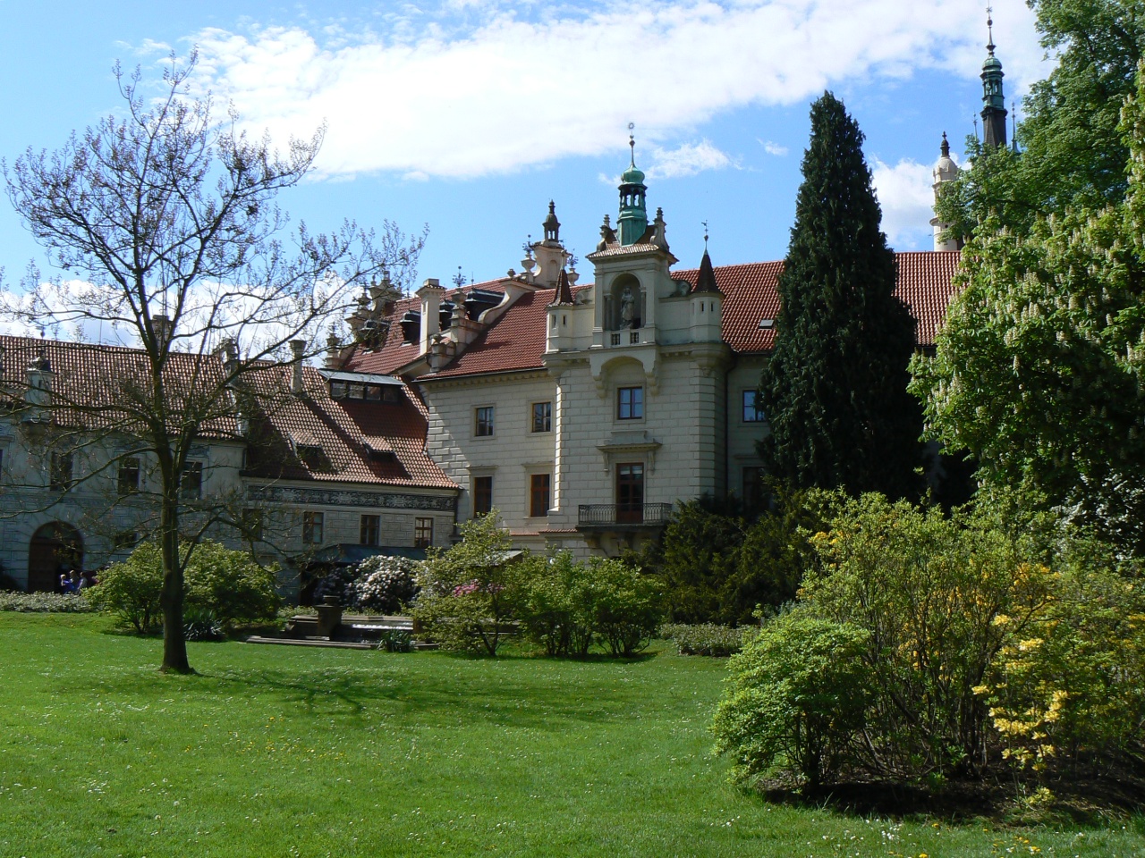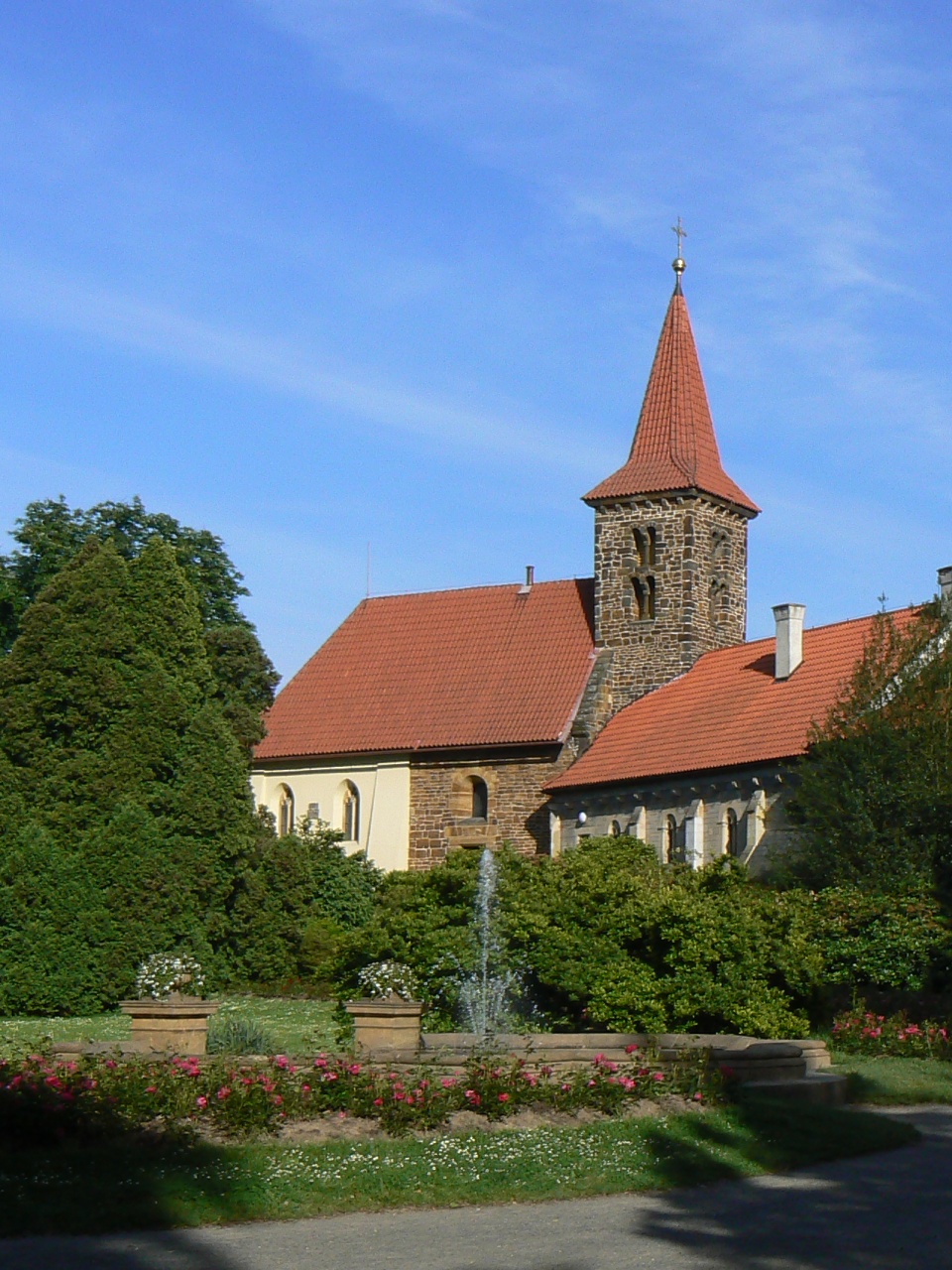 Mezi budovami, tvořícími areál zámku Průhonice stojí i nádherný románský kostel.