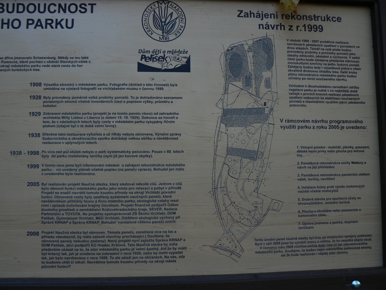 Komu se to nechce číst, pro toho jen stručně - v 19. století vznikl ve Vrchlabí okrašlovací spolek, kterému později v jeho snaze pomohla i krásná hraběnka Aloisie Czernin-Morzin, po které toho zůstalo ve Vrchlabí dodnes opravdu hodně - a na vrchu, zvaném Na Šancích nebo Vrch Panny Marie Pomocné vznikl krásný park s hřištěm na hraní pro děti, tisíci stromů, rybníčkem a později i s krásnou restaurací, vzniklou z pavilou Jubilejní zemské výstavy.