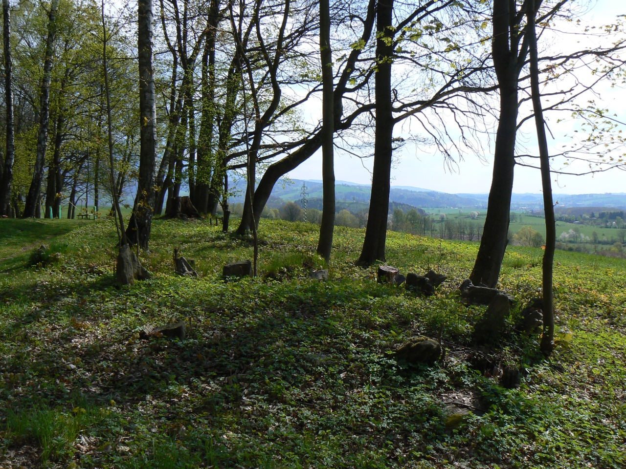 Sice to tu hyzdí dvě polorozpadlé budky, jenž jsou vzpomínkou na postavený a za pár let zrušený lyžařský vlek, ale jinak je tu hezky - jarní tráva hustá jak perský koberec a spousta krásných rozvíjejících se listů. Mezi stromy je tu i čerstvé ohniště - jako už po léta i letos o tajemné noci mezi 30. dubnem a 1. květnem vzplál tady na vrcholu kopce oheň jako vzpomínka na dávné obřady a dávnou víru.