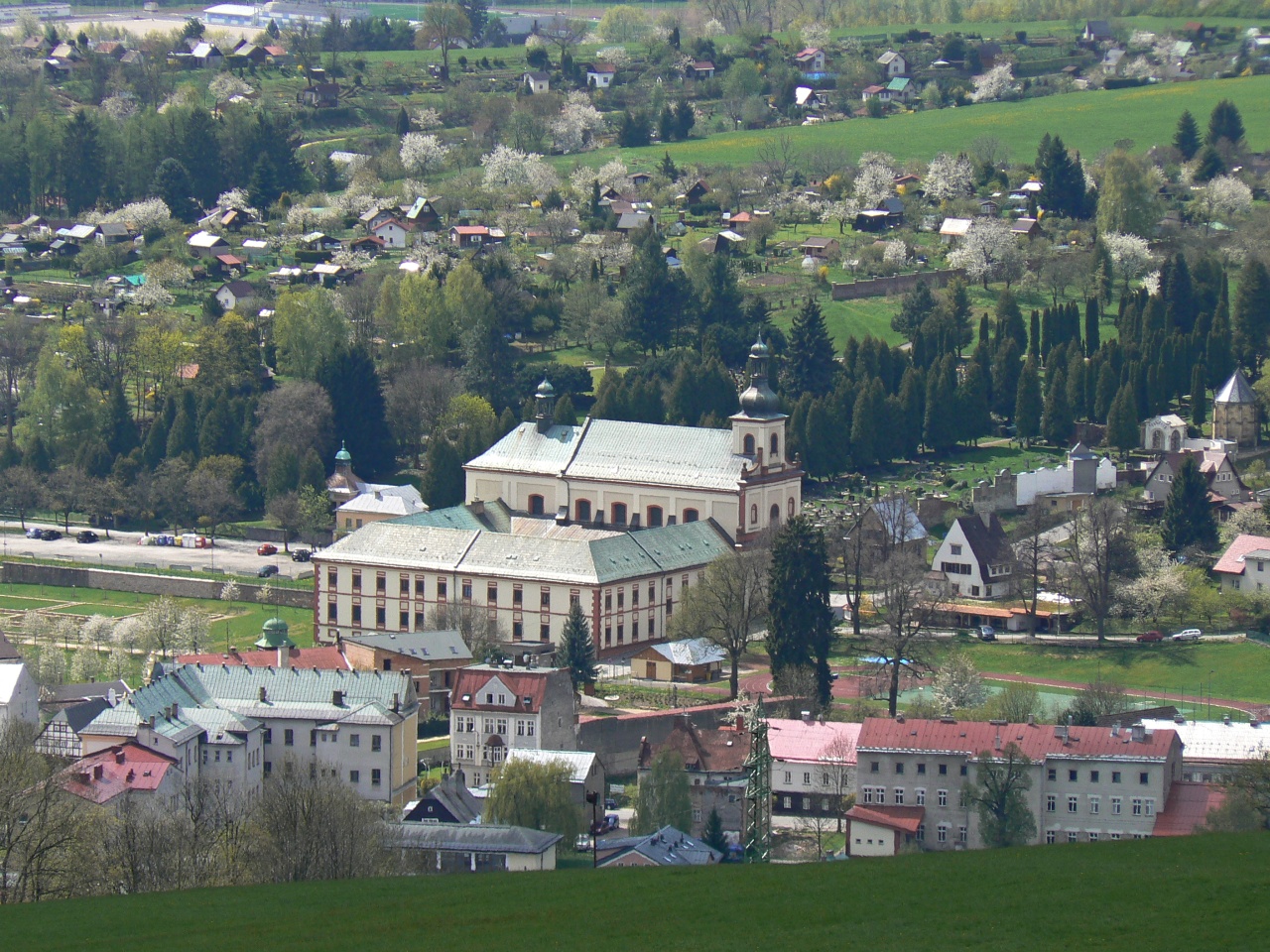 Hezky jsou odtud vidět i některé vrchlabské památky. Tohle je bývalý augustinianský klášter, v němž dnes sídlí Krkonošské muzeum.