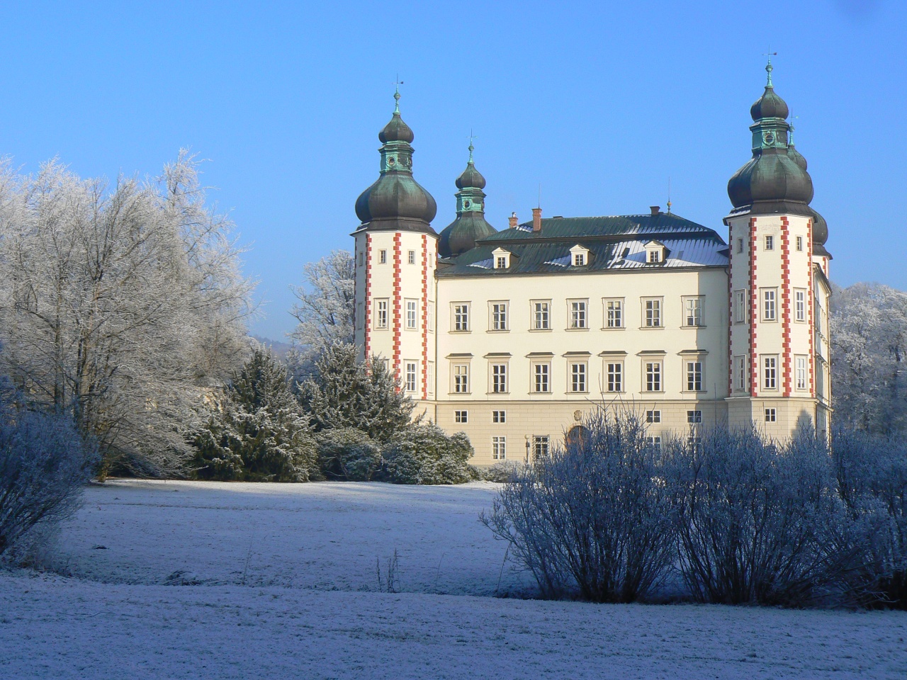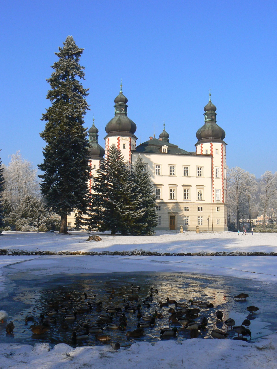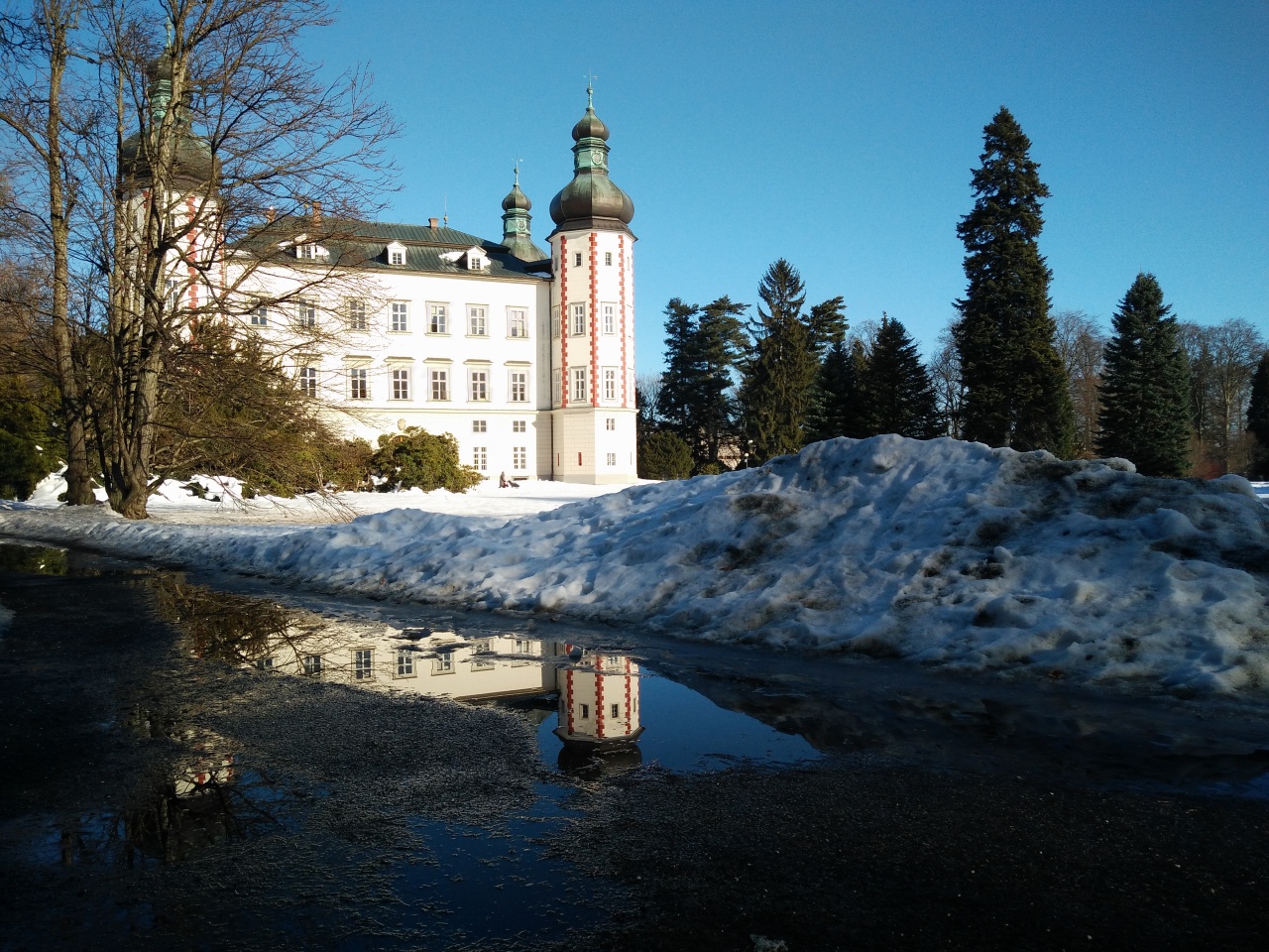 Tohle je náš vrchlabský zámek přes zamrzlý rybníček, který je poslední vzpomínkou na někdejší vodní příkop, druhdy obklopující zámek ze všech stran.
