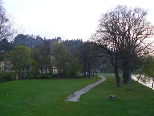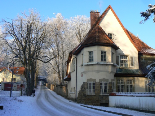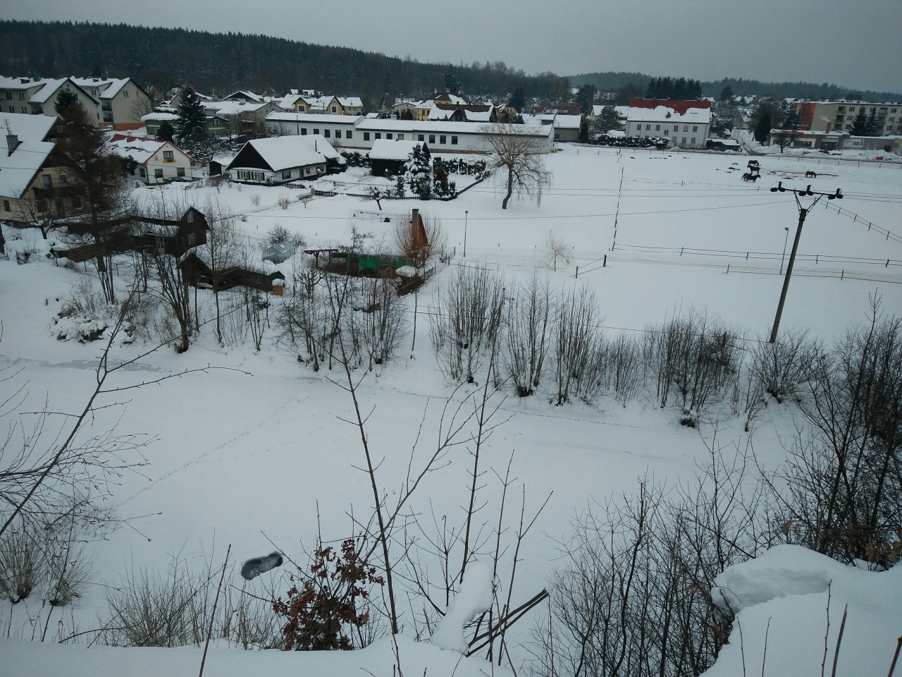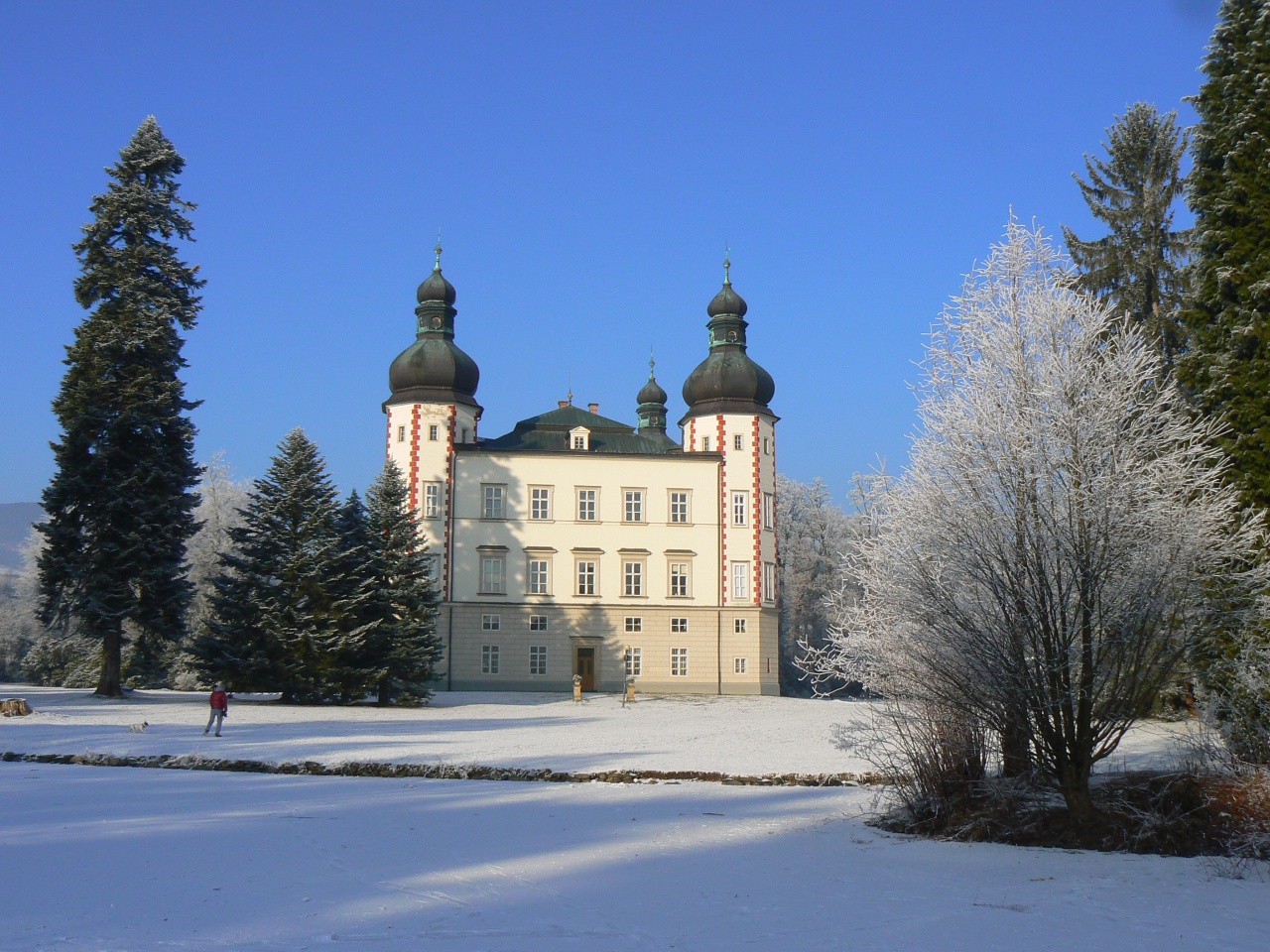 Tohle je náš vrchlabský zámek přes zamrzlý rybníček, který je poslední vzpomínkou na někdejší vodní příkop, druhdy obklopující zámek ze všech stran.