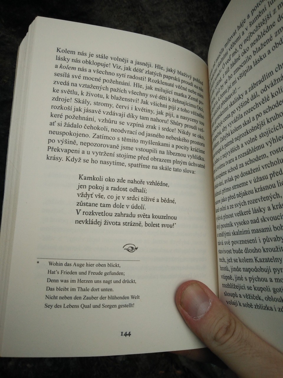 ...možná vás překvapí, jak o moc jiný pocit budí dotek papíru, z něhož je vytištěna. Mnohem silnější je a takový hutnější, trochu možná i drsnější... je to zkrátka papír z doby před vynálezem buničiny a dřevoviny, z doby před vynálezem tiskařského stroje, ručně vyrobený papír ze lněných hadrů.
