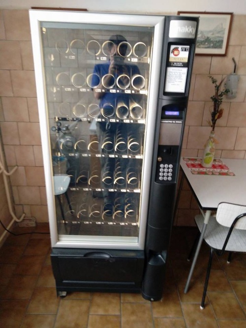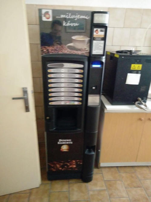 Tady jsme dosud měli jen maličký a jednoduchý automat na kávu - vracet neumí, kelímek si člověk musí postavit sám a vaří jen pár druhů kávy. Nově nainstalovaný automat, jó, to bude jiné kafe.