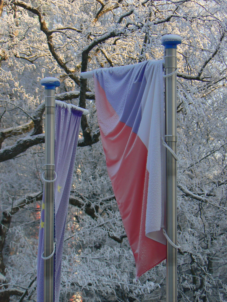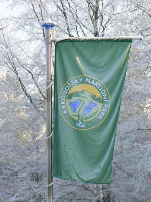 Prapory přes sídlem Správy Krkonošského národního parku ještě před několika dny vesele vlály, ale namočily se a přes noc zmrzly tak, že jsou teď jako plechové.