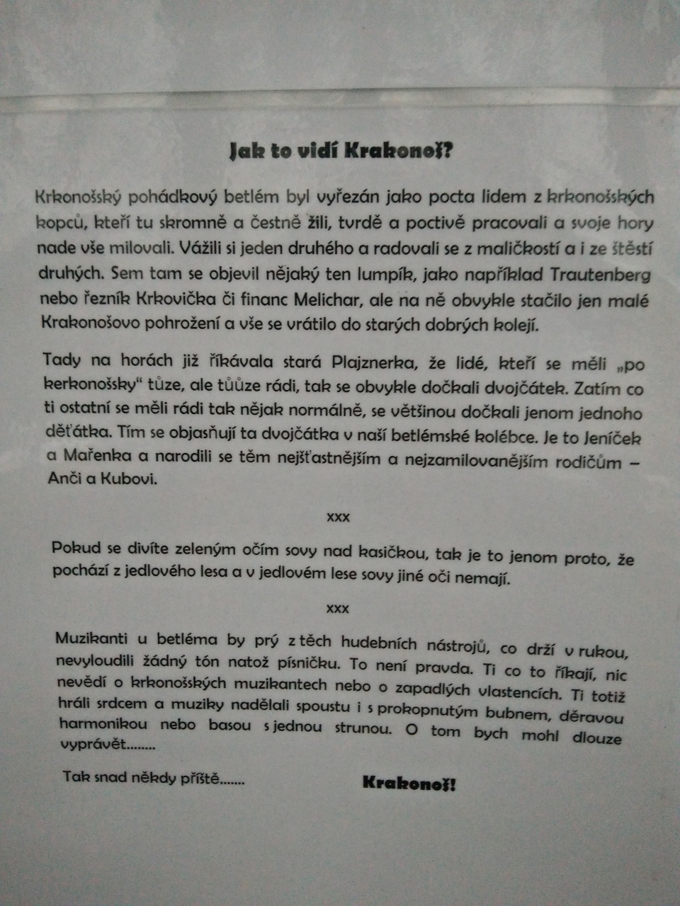 Jeho autorem je Pavel Tryzna a je to pan řezbář velice pilný, každý rok ke Krkonošskému betlému přibude několik dalších figur. K některým místům v Betlémě je tu i krásné, ryze krkonošské povídání.