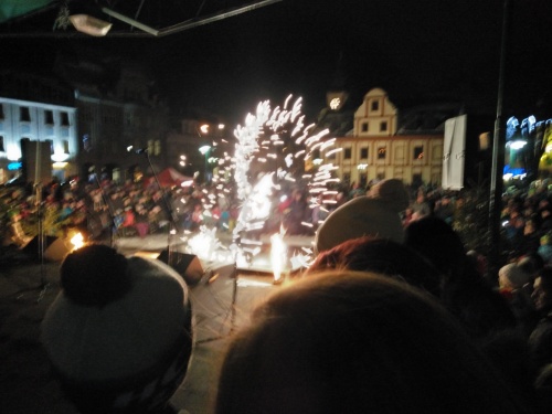 Mezi tím se setmělo, náměstí se zaplnilo lidmi a ti se teď všichni tlačí kolem menšího pódia, umístěného pod velkým, protože na něm teď proběhne vystoupení, pojmenované „Ohňová show“. Lidé se tlačí, tatínkové berou své ratolístky „na koníčka“ a zezadu není šance vidět cokoliv.