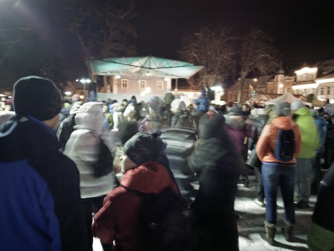 Zpíváme nástupní koledu a při tom pomalu jdeme kolem kruhu zachumlaných babiček a dědečků, kolem vánočního stromu, vcházíme dovnitř a rovnáme se k mikrofonům. Široké zasněžené místo před námi poslouží co taneční parket pro roztomilé tanečky Horálků... my dospělí se však dneska budeme zahřívat jen zpěvem. Vánoční písnička střídá koledu, taneček střídá sólový zpěv některého s Horálků, nakonec i já si zazpívám společně s jednou šikovnou dívčinečkou... a je konec první části. Malí Horálci odcházejí a teď už budeme jen my zpívat.