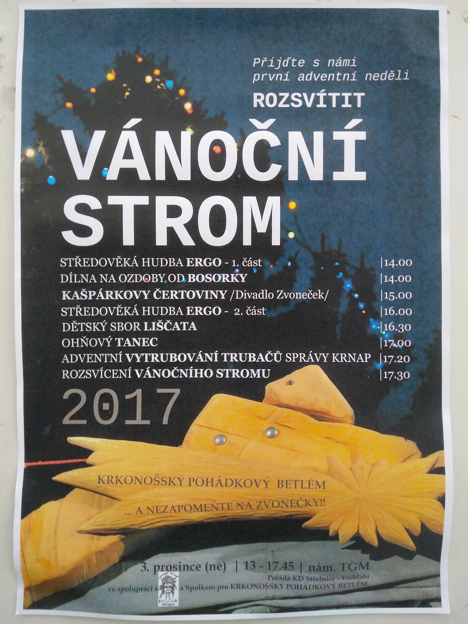 Když jsem viděl program dnešního „Rozsvícení vánočního stromu“, nevěřil jsem vlastním očím. U nás ve Vrchlabí se hraje během roku vážná hudba a také se velmi upřednostňuje jazz a swing, na každoroční „Pivní slavnosti“ se zvou populární skupiny... ale folk, středověké písničky nebo lidové písničky, ty jsou fuj a prostor dostávají minimální. Zajímavou výjimkou se stává „Rozsvícení vánočního stromu“ - loni tu hrála moje milovaná skupina BraAgas a letos tu bude hrát ERGO. Psal jsem tady na mé stránce s hořkostí v srdci, jak mě mrzí, že o náš soubor Krkonošský Horal o letošním Adventu nikdo nestojí... ale teď mě to nemrzí ani trochu. Loni jsem z koncertu skupiny BraAgas slyšel jen jednu písničku a pak jsem musel putovat na sraz a jet do Studence na vystoupení... dnes ale nic takového nehrozí a budu si moct koncert ERGA užít do poslední kapky.