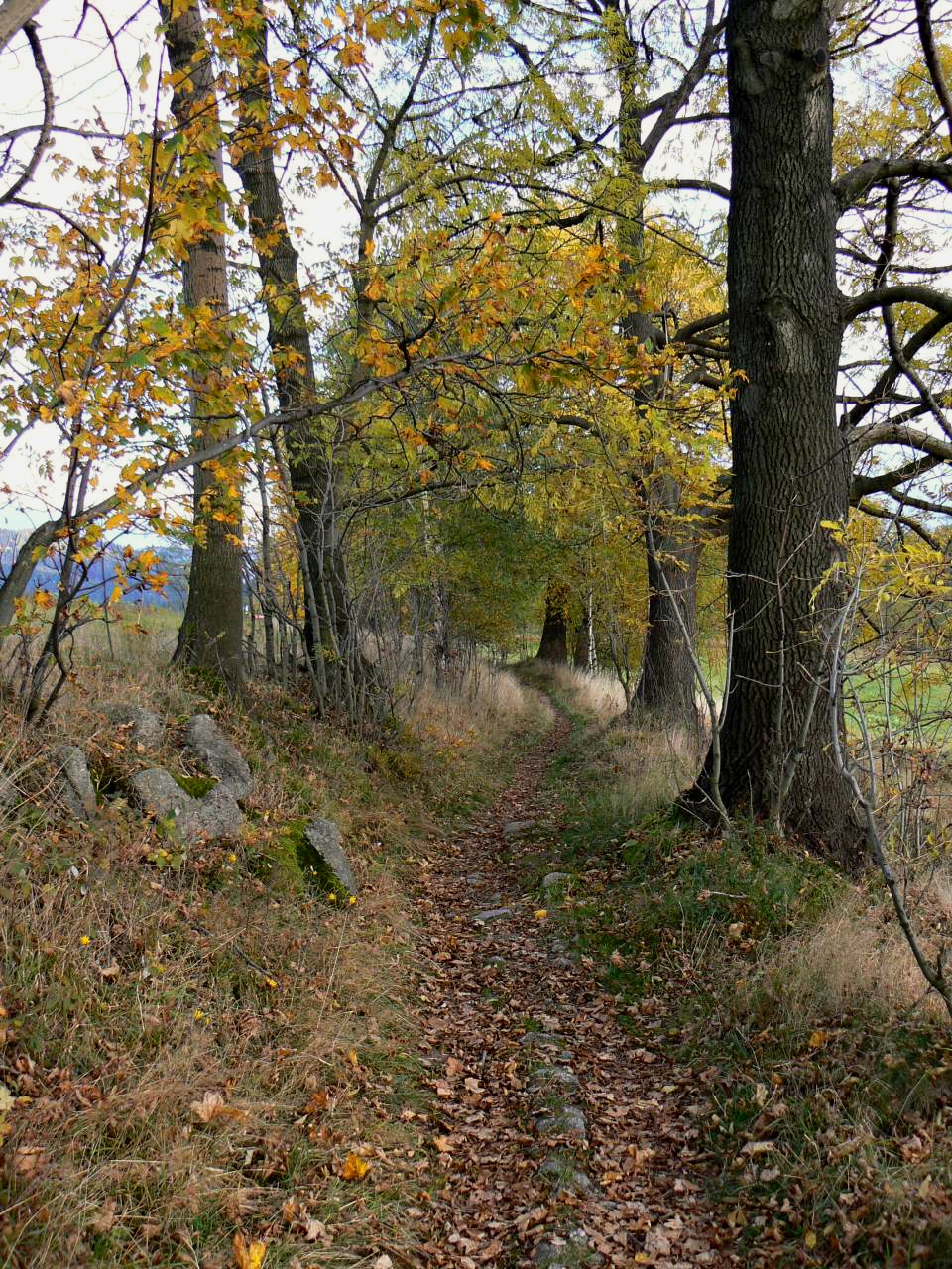 Oproti minulému obrázku jsme lehkým krokem přešli jen několik set metrů blíž ke vsi Horní Lučany a z široké cesty odbočili vlevo na cestu mnohem užší... úzkou cestičku pro dvě nohy, jdoucí krásnými loukami a přitom lemovanou stromy a kličkující mezi hromádkami kamenů ze zaniklých polí, vybraných rukama dávných předků našich. Nenápadná cestička, člověk by si ji skoro nevšiml... a až když po ní vykročí, zjistí jak je krásná. A tak to je i v životě. Nebojte se vykročit.