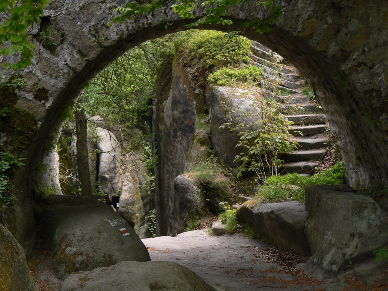 Nic není na tomhle obrázku takové, jaké se zdá. Brána totiž není branou, je to oblouk mostu - mostu, který vede ke kapli Panny Marie Sněžné na Hvězdě v Broumovských stěnách. A zatímco prošlapané schody vzhůru směřují přímo k začátku mostu, cesta dolů jde krásnou skalnatou soutěskou pod skály a pak do města Broumova.