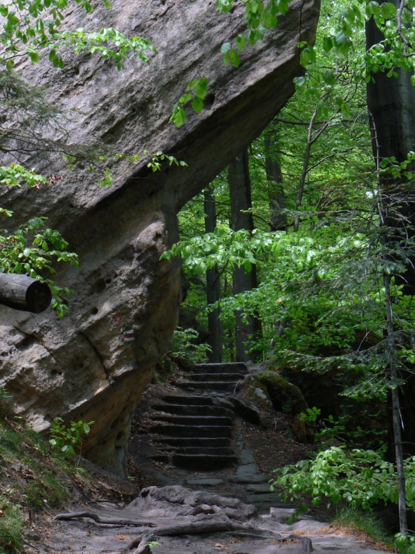 I tyhle kamenné schody, vedoucí pod převislou skalou jsou částí nádherné prastaré cesty, vedoucí Broumovskými stěnami a Stolovými horami z Hvězdy až na Hejšovinu. Je to nádherná a neuvěřitelně členitá cesta, která nabízí skalní průchody, výhledy do úchvatných soutěsek, tichá údolí nebo cestu lesy a kvetoucími loukami.