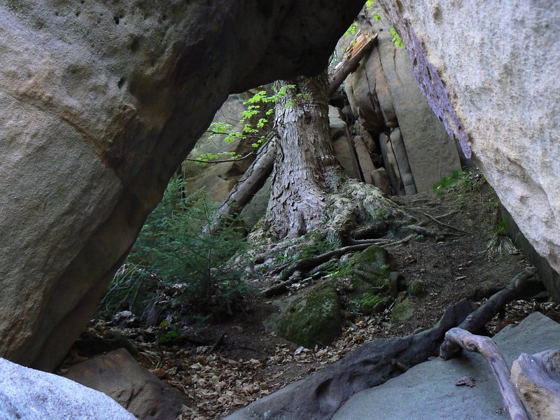 V Kovářově rokli v Broumovských stěnách je spousta zajímavých míst a zákoutí. Jedno z nich naleznete, když půjdete po cestě dolů a po pravé straně se necháte zlákat schody, stoupajícími skalní štěrbinou vzhůru. Když se po nich vyškrábete, zjistíte, že nevedou nikam a cesta končí slepě, obklopená skalami. Ale i tam je co obdivovat, třeba strom, který vyrostl v temném místě, doslova v objetí skal.