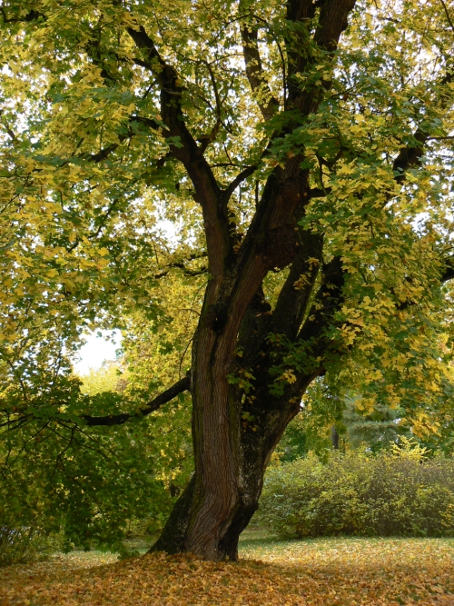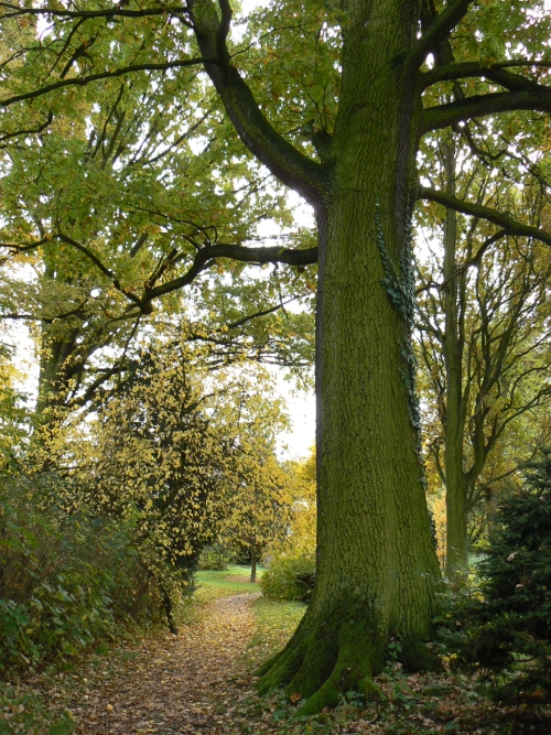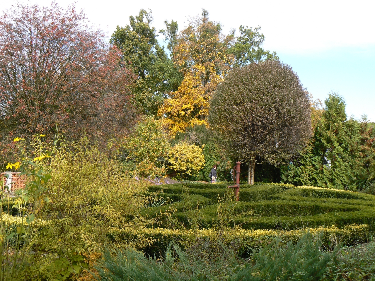 Stěna ze stromů ukrývá užitkovou část zahrady, jíž vévodí dva obrovské mnohametrové fóliovníky. I tady je asi na jaře a v létě k vidění ledacos zajímavého, jenže teď je podzim a tak tu jen fólie znuděně povlává nad sklizenými záhonky. Stačí však popojít pár kroků vlevo a jsme v nádherné části kopidlenského anglického parku.