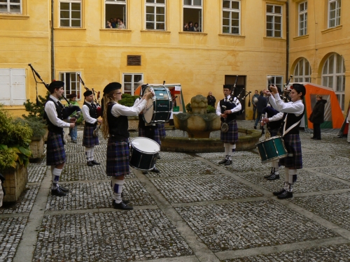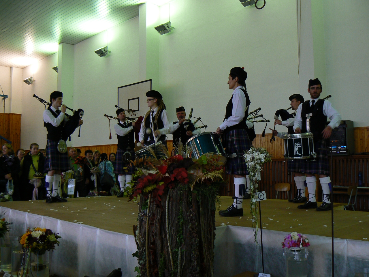 Skotské kroje. The first Czech pipes and drums nám tu dělají radost dalšími svými skotskými písničkami. Já si ale i přesto pořád zpívám písničku Kvítek. "Voníš, voníš sladce a já nemám zdání, ve které zahrádce, kvítku rozcuchaný." Po dudáckém vystoupení nás však čekají kvítky krásné, voňavé a učesané.
