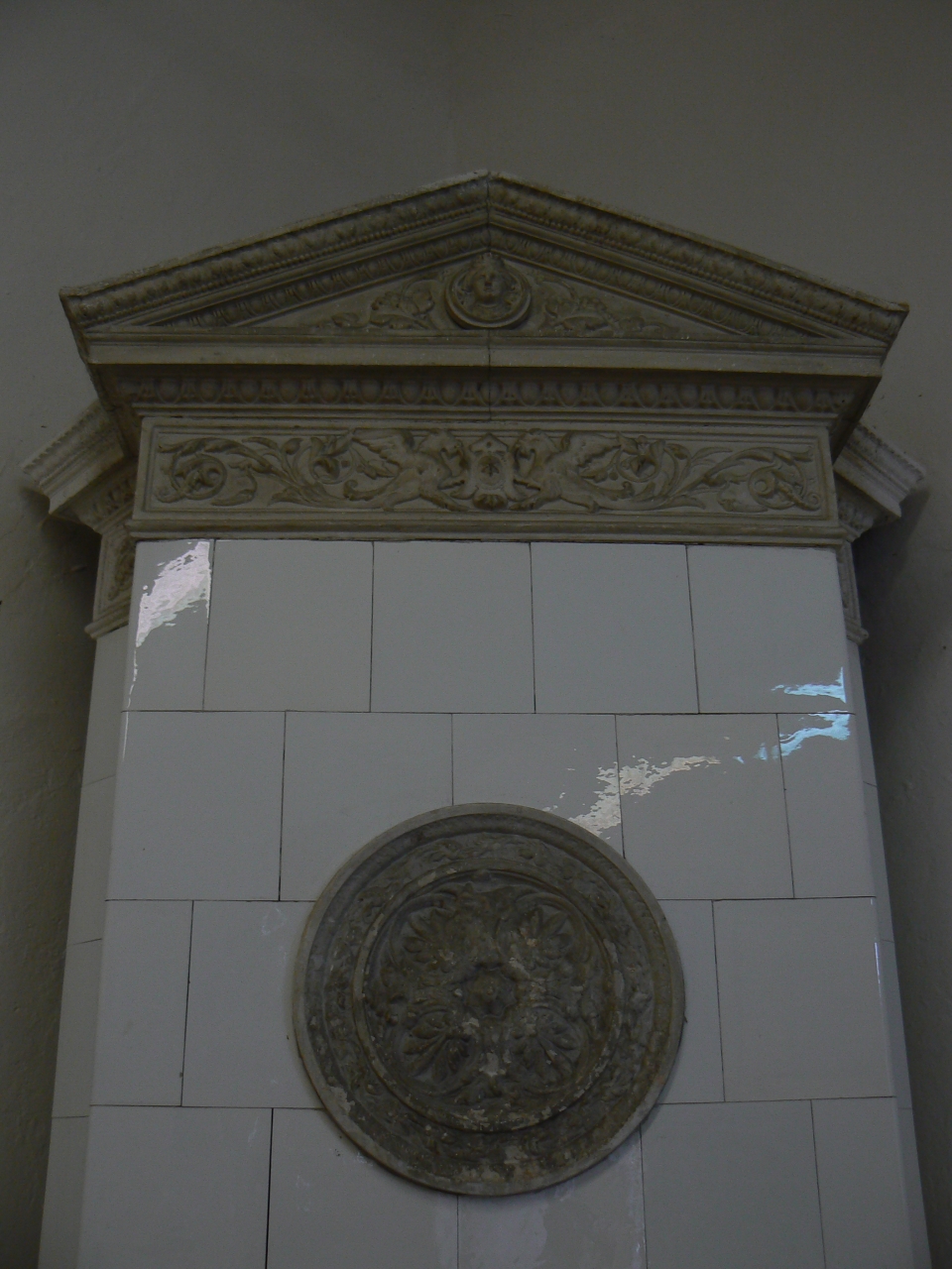 Místnosti vévodí hladce bílá kachlová kamna se štítem jako z antického chrámu.