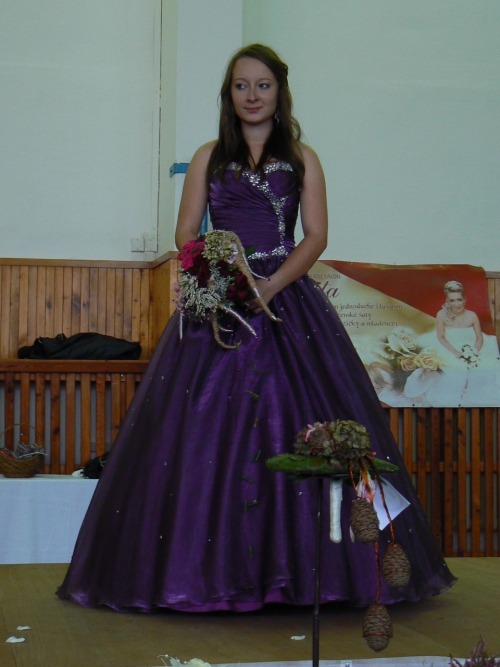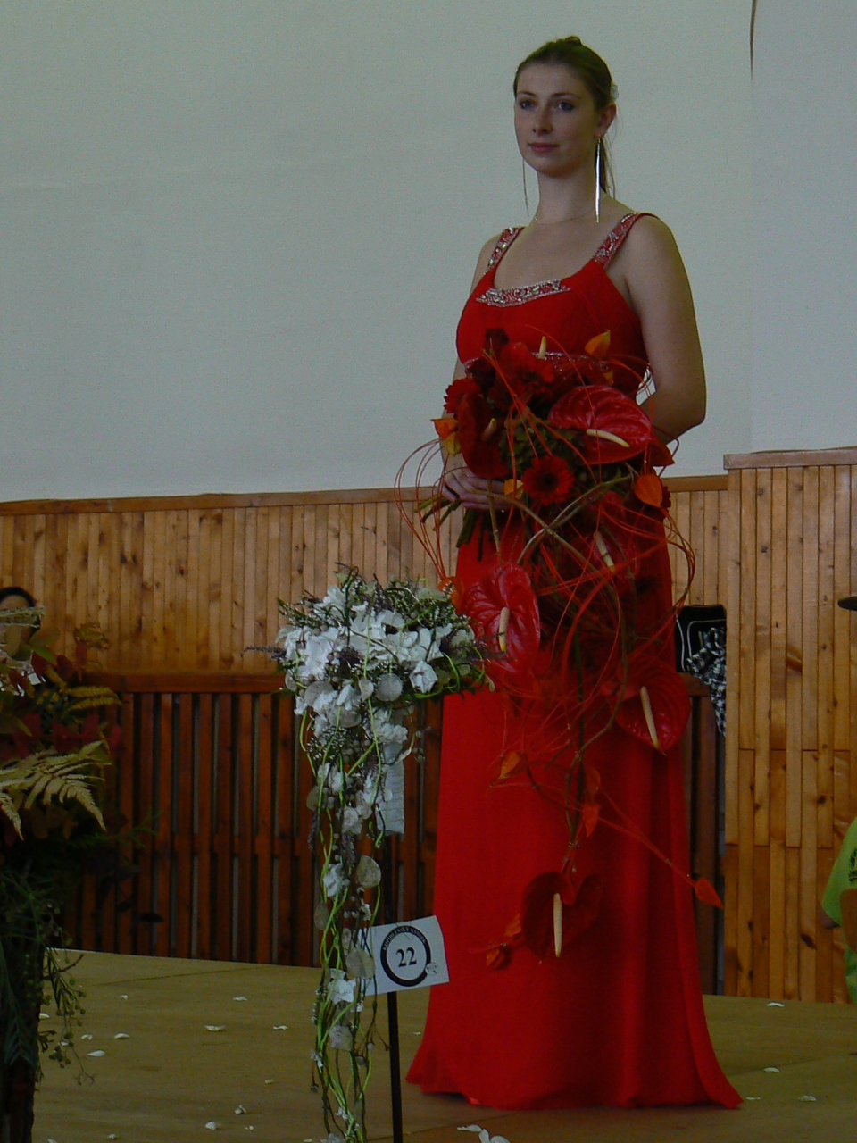 Nevěsty odcházejí, můj foťáček si úlevou vydechne, že zkomírající baterie ho vydržela pohánět až do konce, ale radost je to předčasná, úplný konec ještě není. Na řadě je pár pěkných kostýmů, u kterých se oblečení harmonicky doplňuje s kvítky barevnými a které jsou inspirovány přírodou. Tohle je "Oheň".