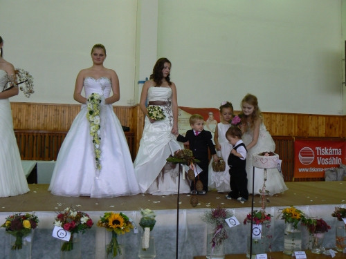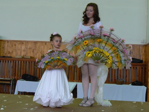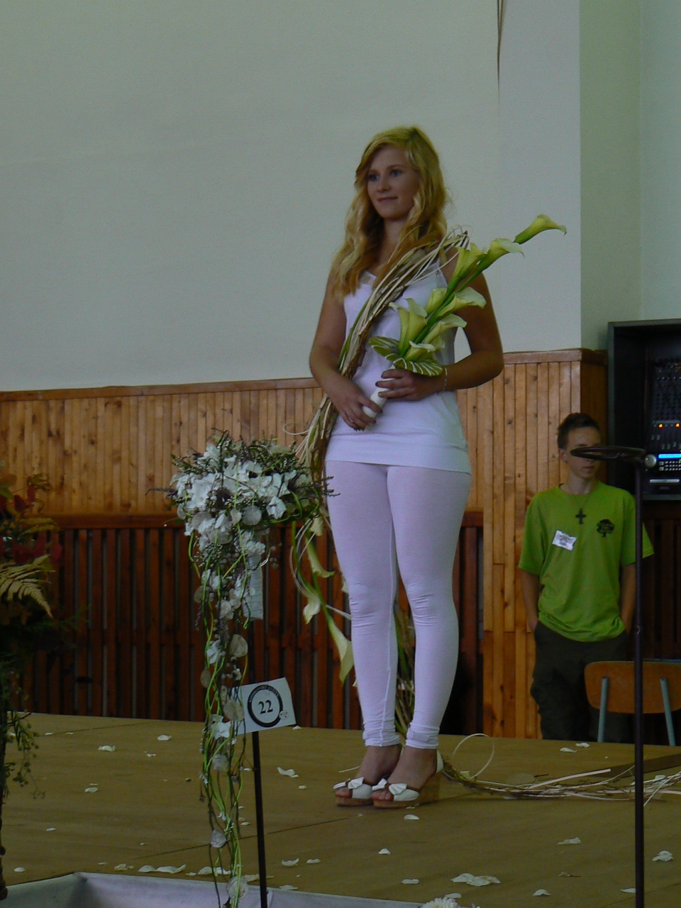 Když už jsme u kvítků, musím ještě připomenout ty kytičky, které dívky drží v rukou i ty, které lemují přehlídkové molo. On Kopidlenský Kvítek je mimo všechno to, co už jsme viděli, hlavně soutěží ve vázání těch nejkrásnějších kytic a všechny ty kytičky pochází z této soutěže. Až skončí tahle přehlídka, bude delší přestávka, po ní všechno proběhne ještě jednou a poté se všechny soutěžní kytičky, kytice a pugéty budou dražit. Komu se líbí, může si přihodit a budou jeho.