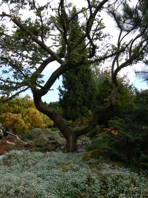 Vedle oranžérie je pěkná skalka s mnoha rostlinami, keři a malými stromy.