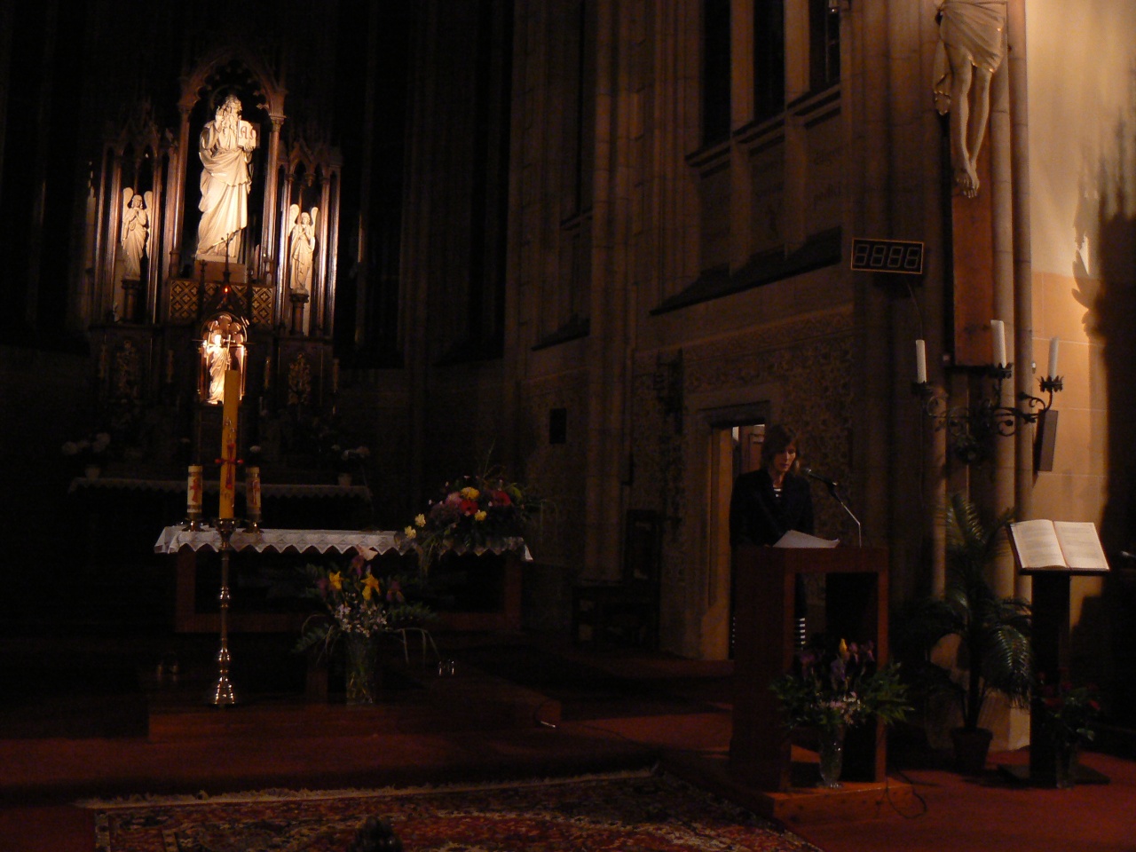 Nad kostelem nebe pomalu mění barvu z podmračené šedé na sametovou barvu noční tmy a my procházíme kostelní předsíní, dveřmi ze skla a dřeva a... už jsme tam, pod vznosnou lomenou klenbou nesenou štíhlými sloupy, k níž stoupal už nespočet modliteb i nadějí, že budou vyslyšeny.