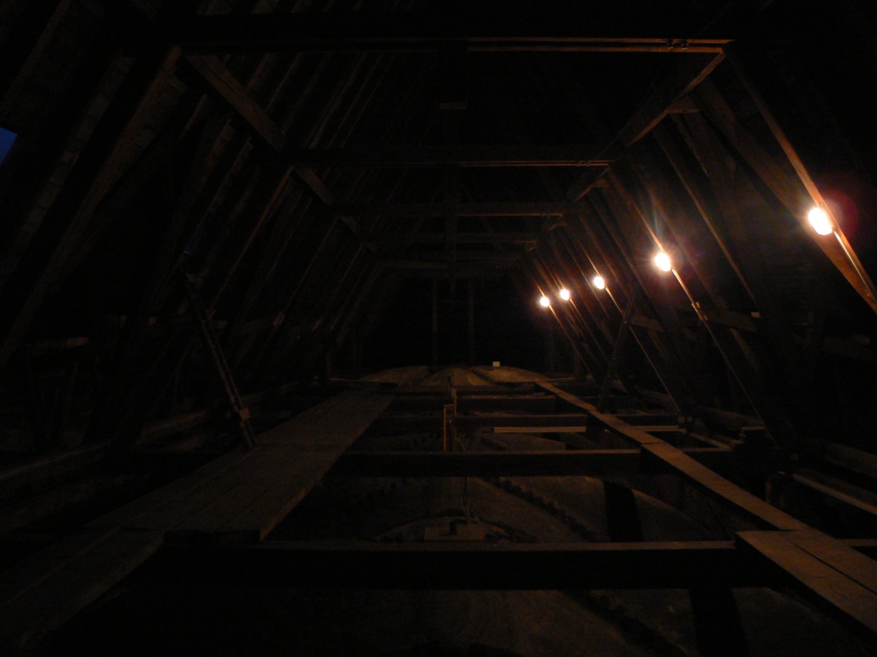 Schody nás však zvou na další cestu k nebesům. Nejdříve to jsou kamenné točité schody postranní věžičkou a poté strmé dřevěné skrz členitou kostelní věž. Našemu oku je v dnešní výjimečnou noc dovoleno padnout i na místa, jenž zůstávají jinak skrytá...