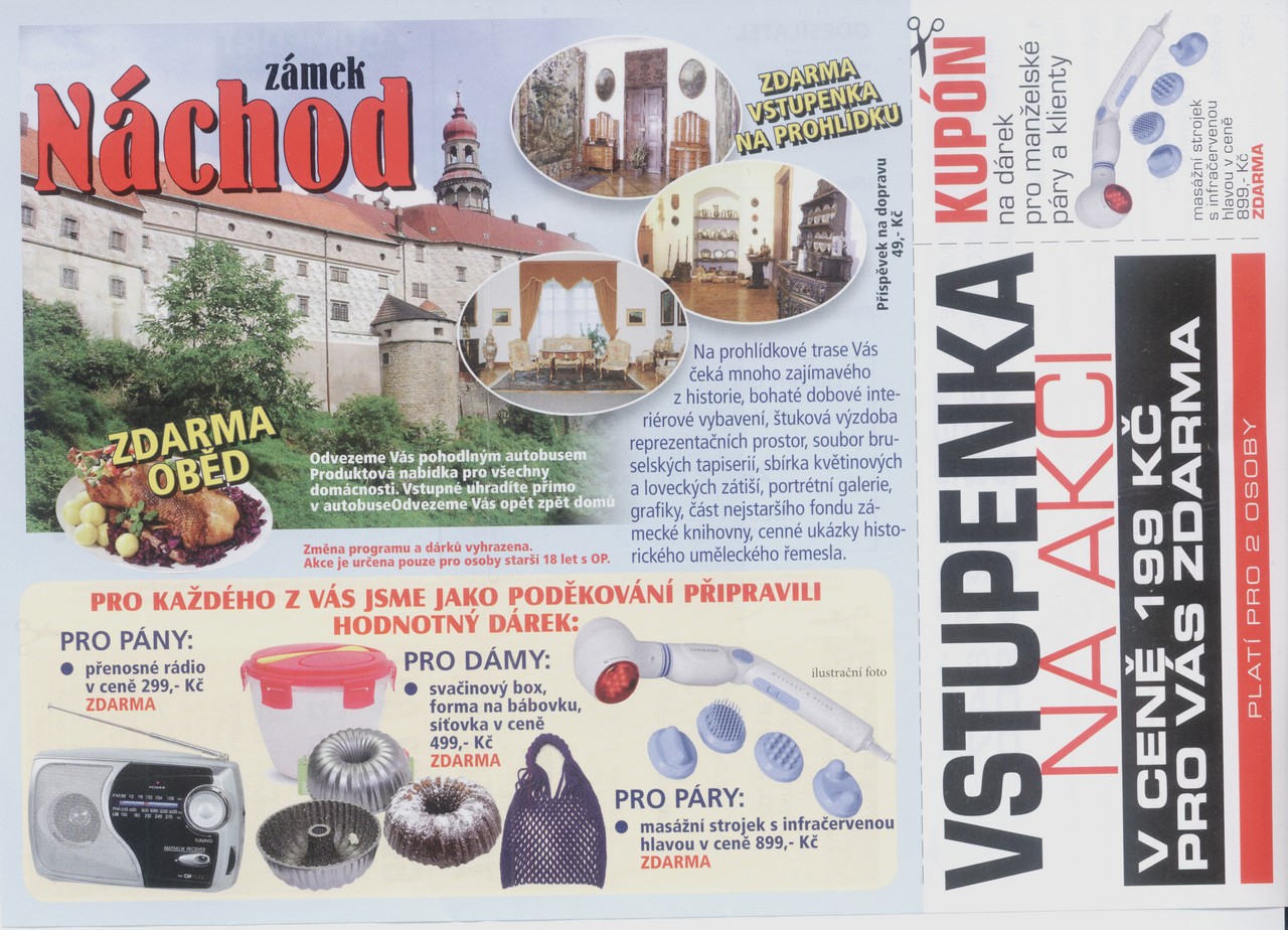 Důležitá je věta na lícové i rubové straně letáku Změna programu a dárků vyhrazena. a Pořadatel si vyhrazuje právo na změnu dárků a programu. Pořadatel vám tak zcela v souladu se zákonem dává najevo, že bude naprosto v pořádku, pokud strávíte místo návštěvy zámku 12 hodin v nevytopené místnosti při intenzivní přesvědčovcí akci, že nemůžete bez jeho výrobků žít a na zámek v Náchodě vám tak zbude čtvrthodinka času půl hodiny po zavírací době. O dárcích a obědu ani nemluvě.Ještě je zajímavý pohled na dárečky - pro páry se tu zjevně nabízí Masážní strojek Concept MS-7210. Kliknete-li na odkaz, dostanete se na vyhledávač zboží Jyxo, který našel, že je strojek prodáván za cenu mezi 499 Kč a 599 Kč. Cena 899 Kč, udávaná v letáku je tedy nepravdivá a nadsazená. Toť drobná ochutnávka z velmi oblíbených fíglů, kterých pravděpodobně zažijete během zájezdu nepočítaně.