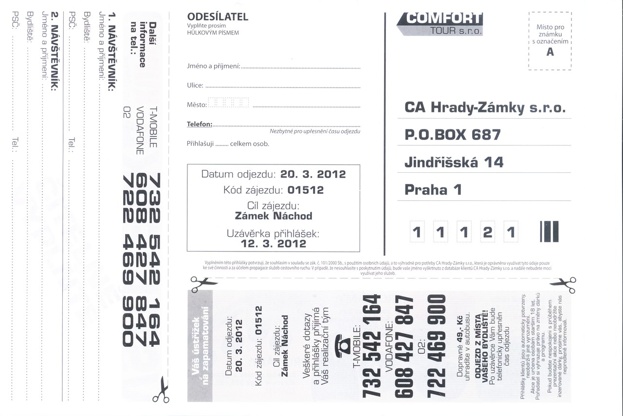 Jako první si spolu přečteme leták společnosti CA Hrady-Zámky s.r.o., zvoucí nás na konec března na zájezd, jehož cílem je zámek v Náchodě. Zde mám pro vás lícovou i rubovou stranu letáku - po kliknutí na náhled se vám otevře větší obrázek.