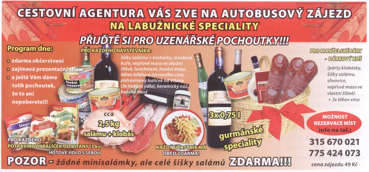 Při pohledu na lícovou stranu letáku se člověku sbíhají sliny - spousta lákavých salámů, konzerv, hotových jídel, vín... a to všechno dostaneme, pokud vyrazíme na zájezd. Podrobně je tu popsán program - čeká nás občerstvení zdarma, zajímavá prezentační show a ještě dostaneme tolik pochoutek, že to ani nepobereme. Zbytek letáku tvoří jen podrobný popis toho, co všechno za svých 49 Kč dostaneme a telefonní čísla, kde si lze zájezd zarezervovat. Věci, jako například místo, kam se pojede nebo jak dlouho bude zájezd trvat, jsou zjevně v očích pořadatele zájezdu zbytečné.Ale něco přece ještě na lícové straně letáku je. Máte-li skutečně dobré oči a bystrý postřeh, odhalíte, že se tam nachází i IČO firmy a nápis: Vstup a bonusy jen pro starší 18 let. Změna programu a bonusů vyhrazena. *Ilustrační foto. Nemůžete je najít? Podívejte se do pravého a levého horního rohu. Můj naskenovaný obrázek je navíc skoro dvojnásobný, než skutečný leták, na skutečném je písmo velké zhruba půl milimetru a nápis je skoro nečitelný. Člověk ho přehlédne i kvůli v obou rozích použitému pozadí se salámy. Přitom poselství nápisu je zcela jasné - pořadatel zájezdu si vymiňuje právo nesplnit třeba vůbec nic z toho, co slibuje a nebude za to vůbec nijak postižitelný.