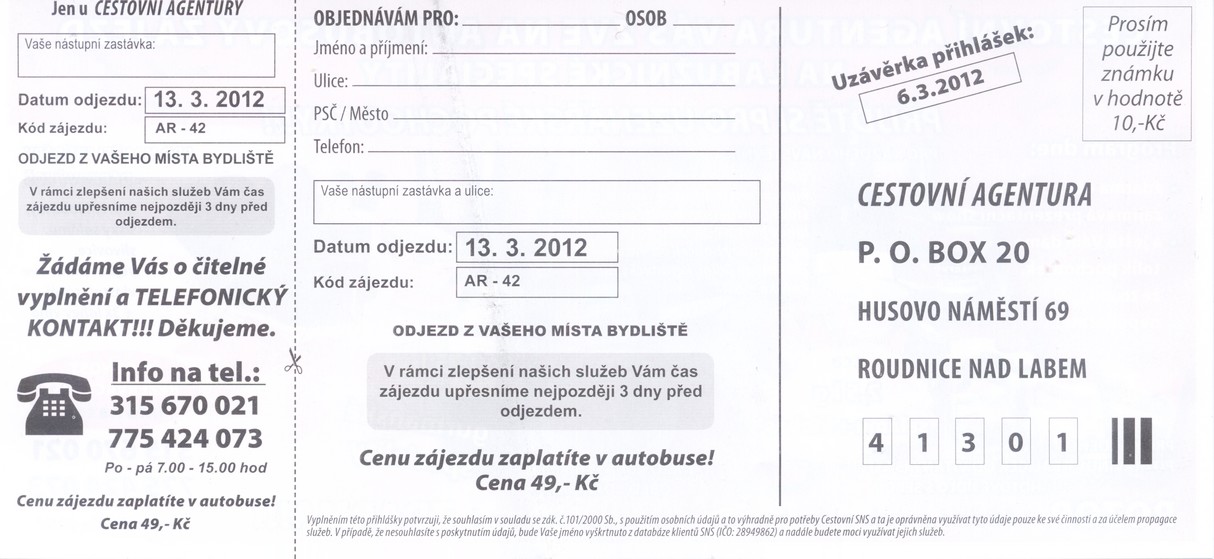 Rubová strana je určena pro kontaktní informace a v případě zájmu i pro vyplnění údajů o vás. Nechybí pochopitelně ani drobnými písmenky vytištěný nápis, že souhlasíte se zpracováním svým osobních údajů, kde najdete i o něco více čitelnější IČO firmy. Zajímavá je i adresa - CESTOVNÍ AGENTURA, P. O. BOX 20, Husovo náměstí 69, Roudnice nad Labem. Opět jde jen o adresu pošty, kde má firma zaplacenou poštovní přihrádku.