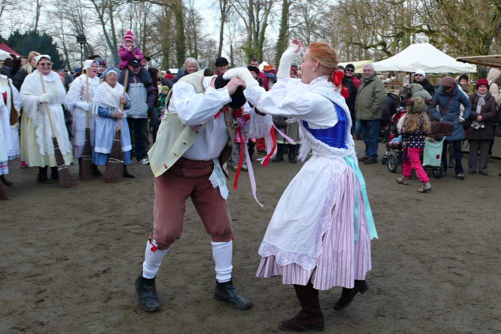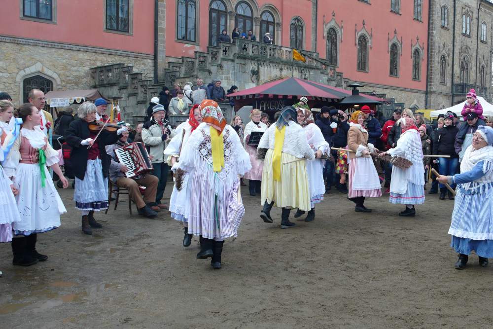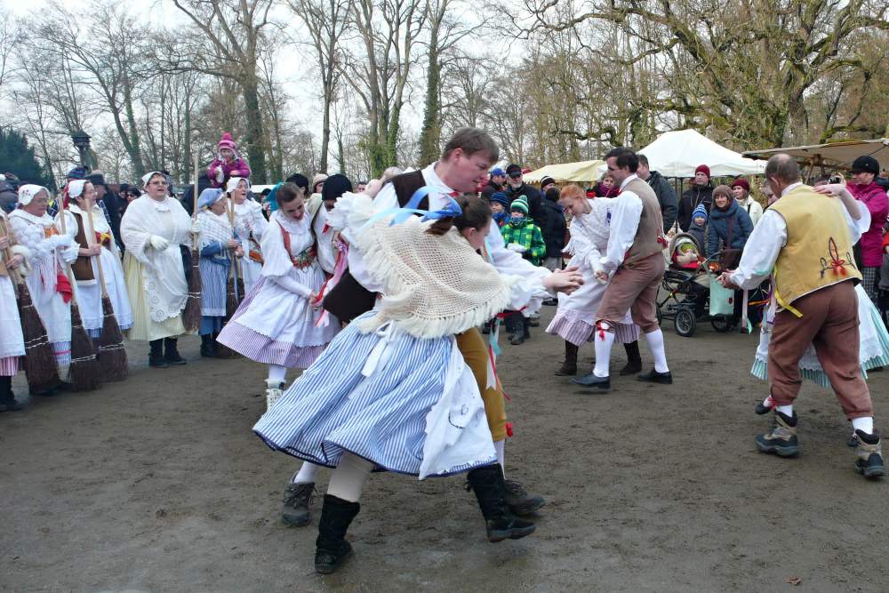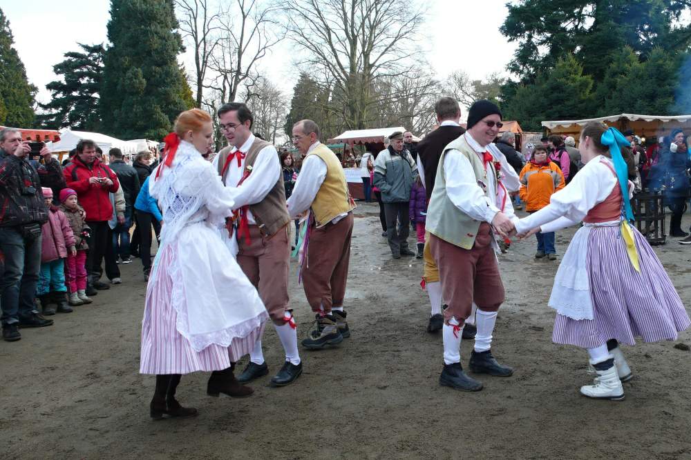 Páni, to je lidí! Sluníčko putuje výš po světle modrém zimním nebi a takové krásné počasí přilákalo spustu obecenstva. Přicházíme do širokého kruhu, který tu pro nás lidé nechali, zpěvačky se dávají do zpěvu a my do tance.
