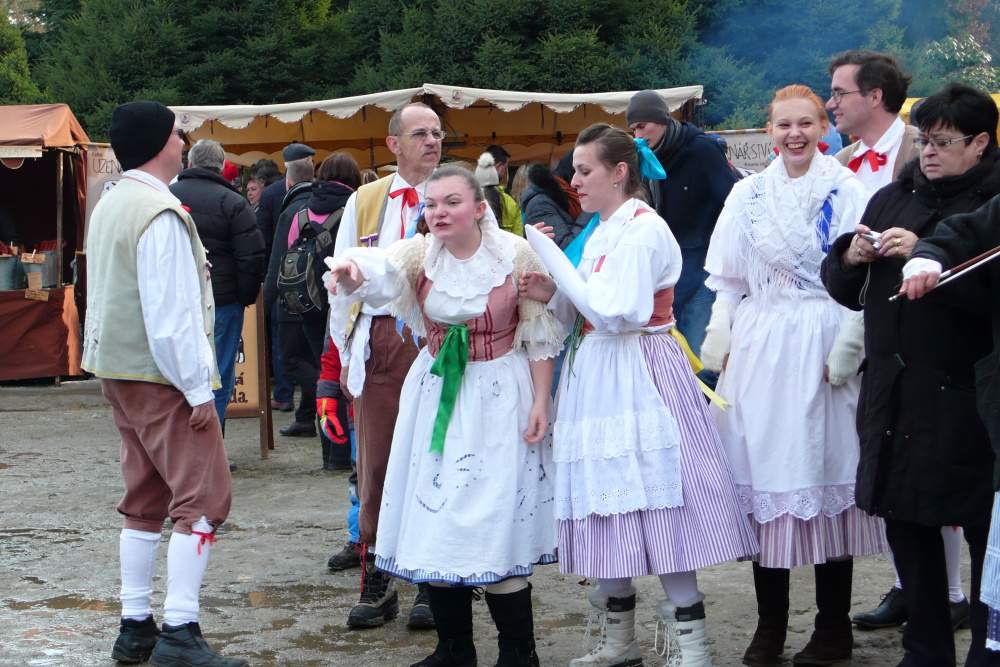 Dlouho tam však nepobudu... mám žízeň a kdepak žízeň na masopustu. Hned vedle vchodu mě zaujme stánek s různými lahůdkami a nejvíc mi do oka padne zelňačka. To je přesně to, na co mám teď chuť. Hned si objednávám plnou misku a k ní pivo... lidičky kolem se na mě usmívají a někteří si mě i fotografují. Horalský kroj se jim líbí. A mně to dělá obrovskou, neskutečnou radost. Také si rád prohlížím a fotografuju ty krásné lidi, co nám dělají radost hudbou a tancem... dneska poprvé v životě zažívám, jak krásné to je být jedním z nich.