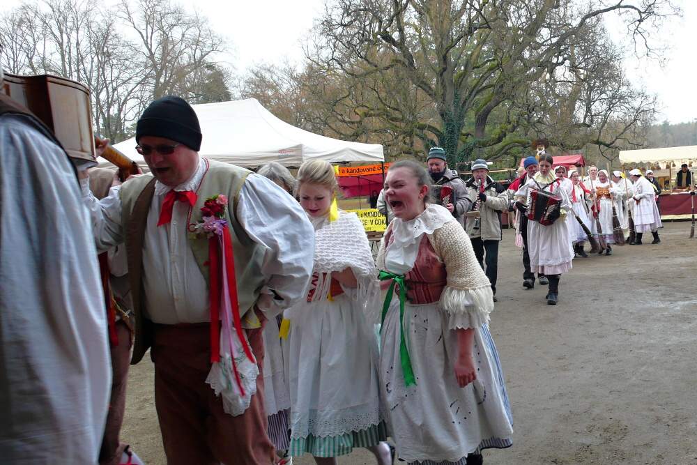 I když jdu s předstihem, u Střelnice už je živo. Bohužel ne úplně kompletně živo - chřipková epidemie si zařádila i v Horalu a někteří se dneska místo tance a zpěvu budou mračit v peřinách. Někteří včetně našeho vedoucího Standy, kterého naštěstí dokáže bez problémů zastoupit jeho milá žena Eva. Vynášíme buben, basu, košťata, nástroje a rekvizity, nakládáme všechno do několika aut - a čeká nás cesta daleká kolem 50 kilometrů, jejímž cílem je romantický novogotický zámek Sychrov.