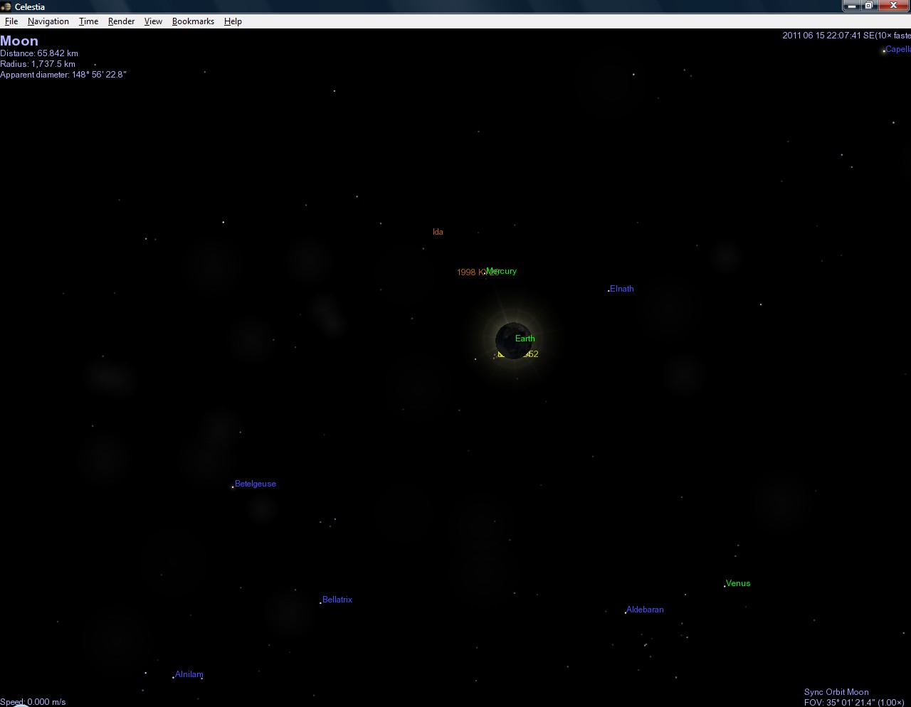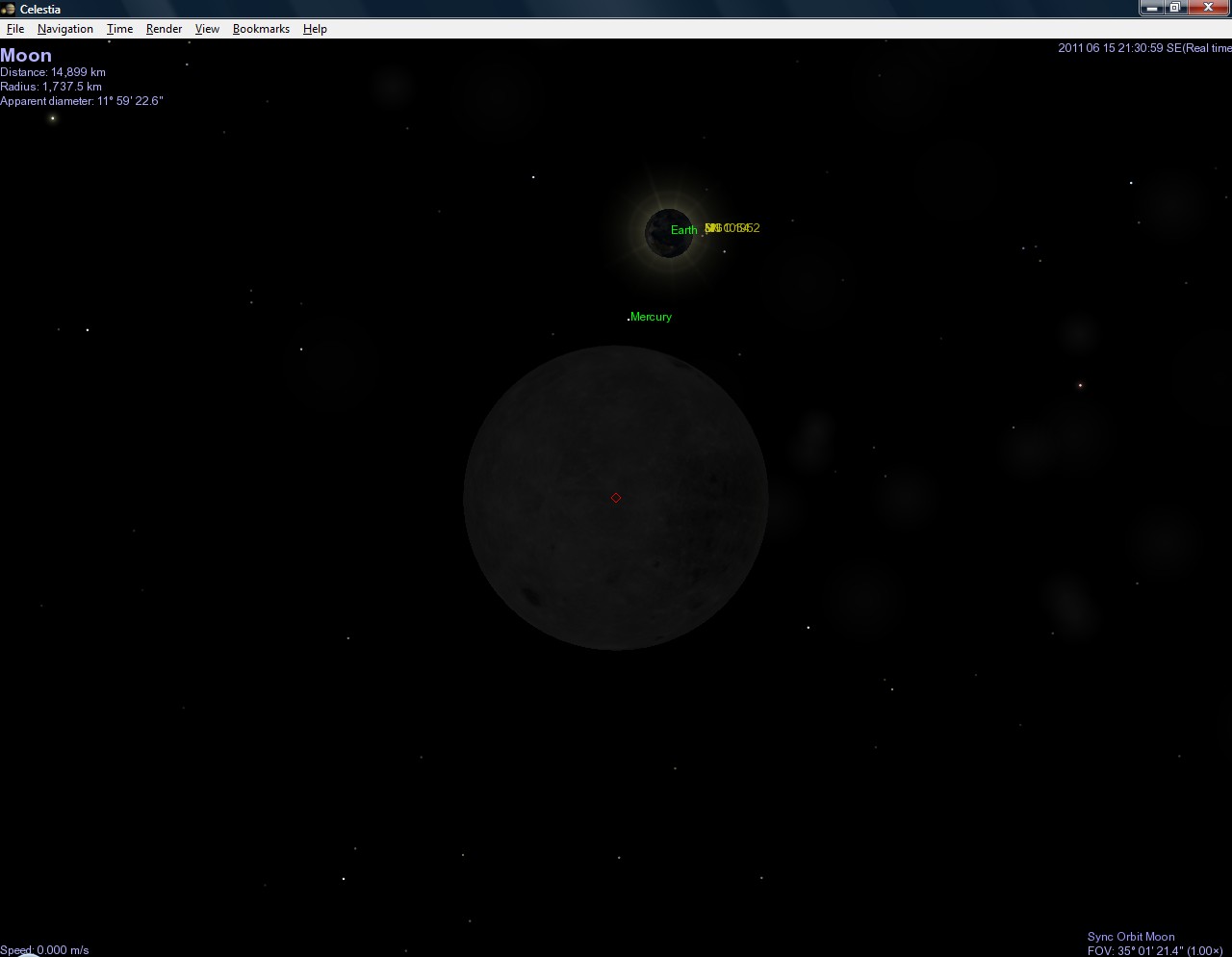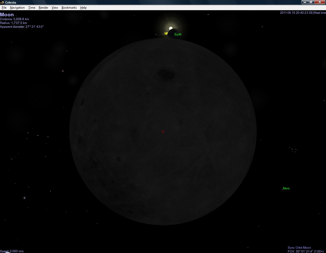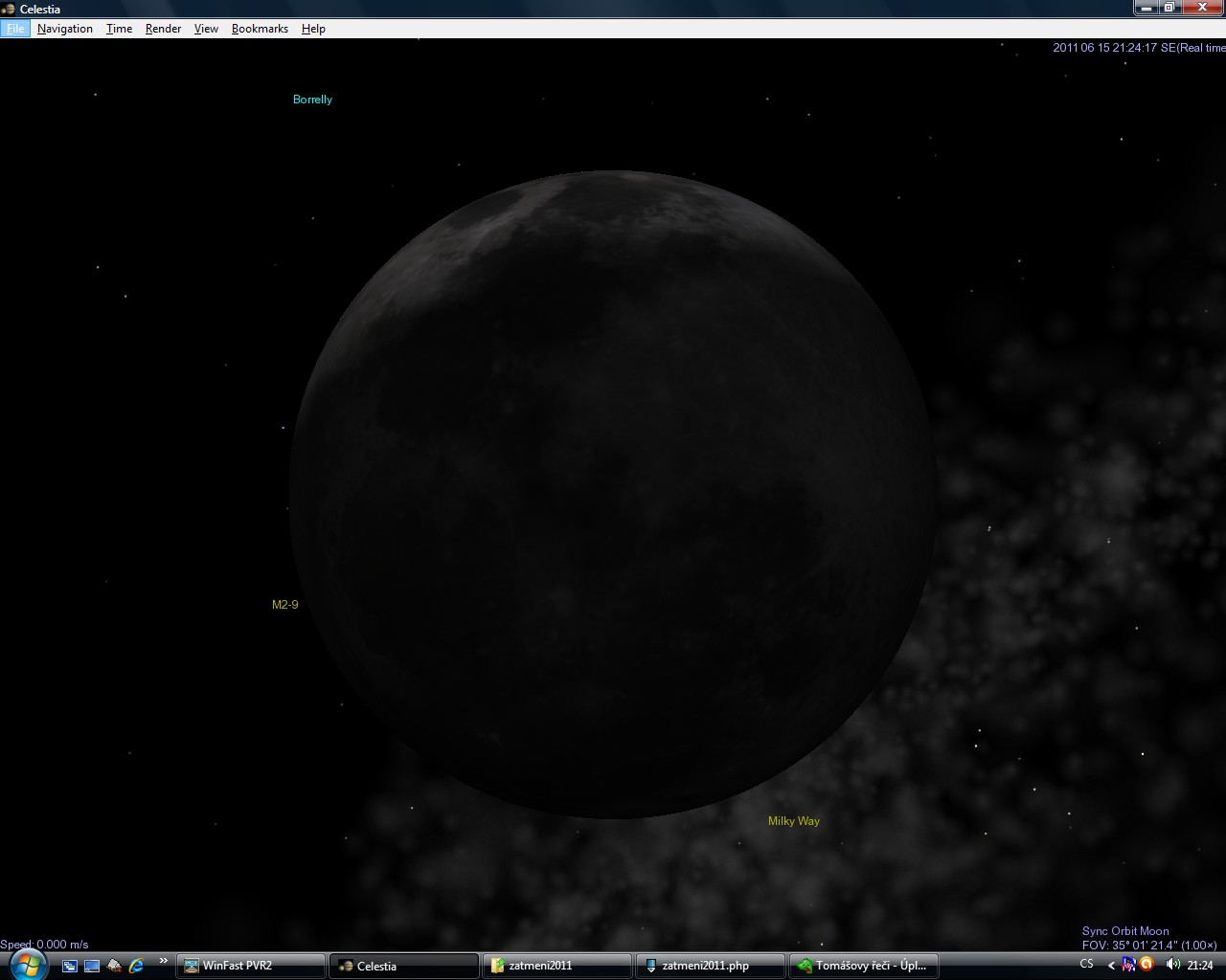 Naštěstí existují šikovní lidé, kteří vytváří úžasné programy. Jedním z nich je i astronomický program jménem Celestia, který - pokud stránka ještě nezanikla - najdete na stránce http://www.shatters.net/celestia. Ten dovede úžasně zobrazovat planety, jejich měsíce, hvězdy, různé galaxie a dokonce vzácně i některé planety v jiných hvězdných soustavách. A tak jsem ho spoustil a počátek zatmění sleduji v něm.