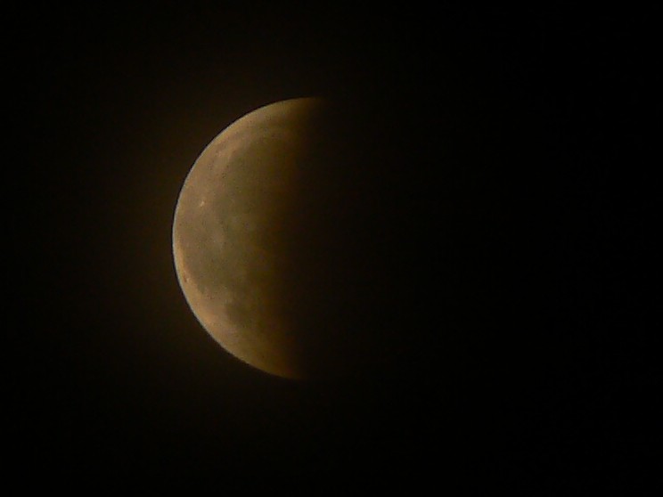 21:59 Měsíc se blíží ke středu stínu Země, kterým prochází jen asi 5x za sto let - ale bohužel, v Podkrkonoší mi štěstí nepřeje, už se zatáhlo docela a z Měsíce není vidět vůbec, ale vůbec nic.
