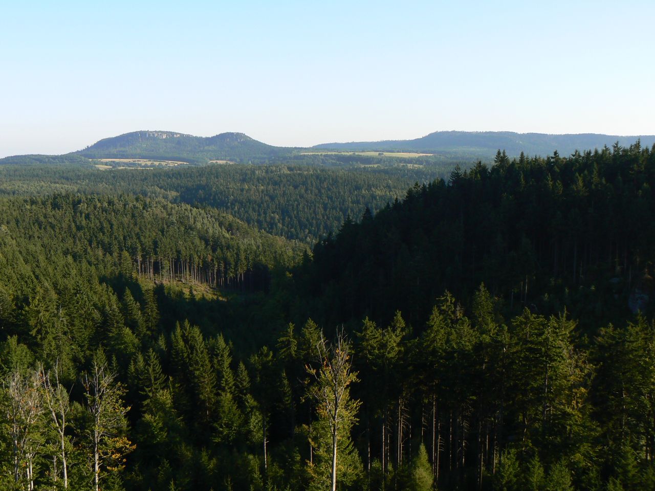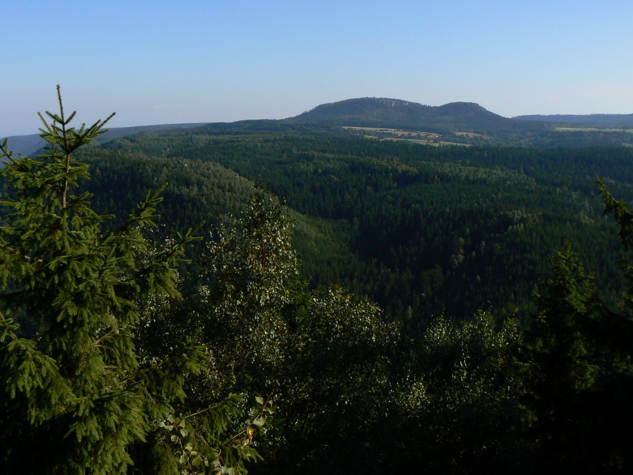 Náhle se les rozestupuje a z na pohled nízké skalky se nám otevírá ohromující výhled. Skalka je totiž skalkou jen na pohled z dálky, když ni stojíte, zjistíte, že to je vysoká skála na okraji strmého srázu. Vidíme odtud krásně Velkou a Malou Hejšovinu...