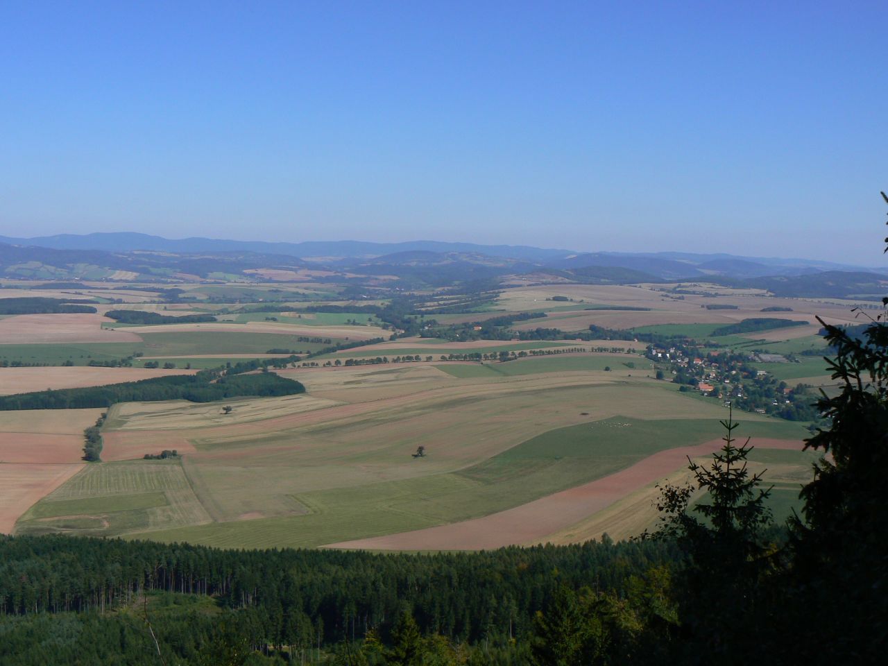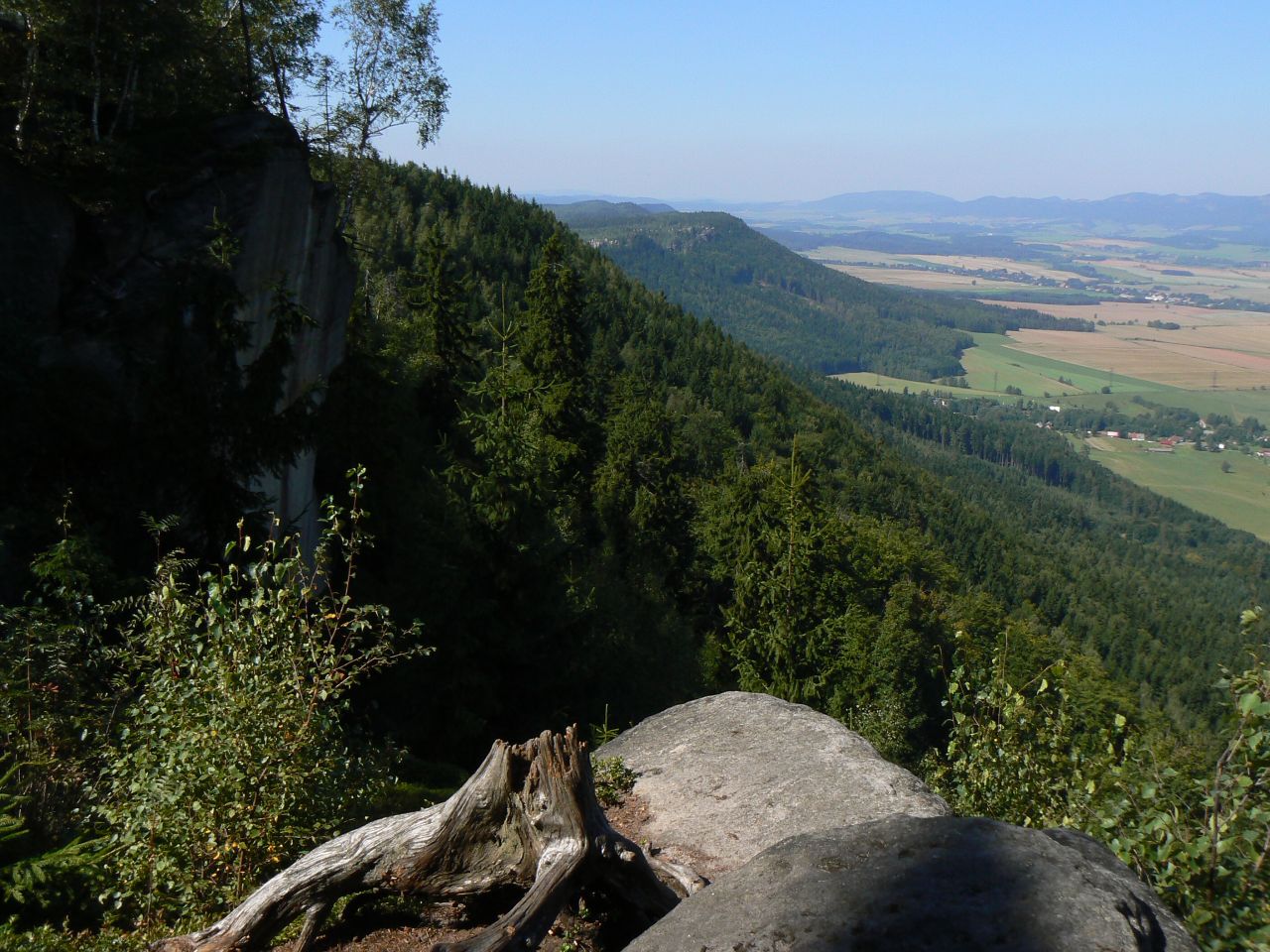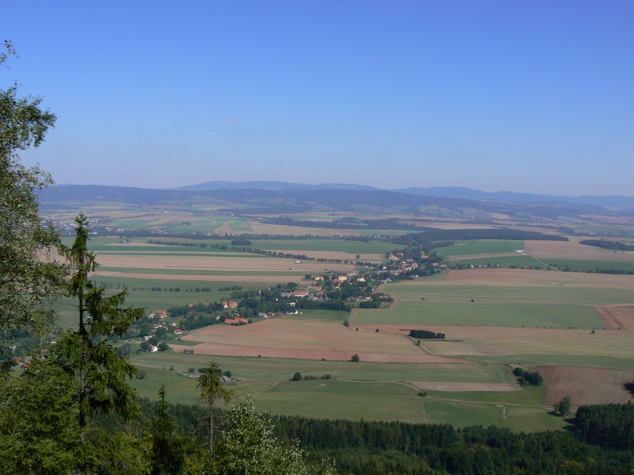Z téhle vyhlídky je ještě krásnější výhled, než od Kamenné brány. Vidíme pod námi lesy, pole, louky a vesničky Broumovské kotliny a za ní se k nebi vypínají mnohé vrcholky sopečného pohoří jménem Javoří hory a za nimi ještě vyšší hory - Góry Kamienne s nejvyšší horou Waligórou.