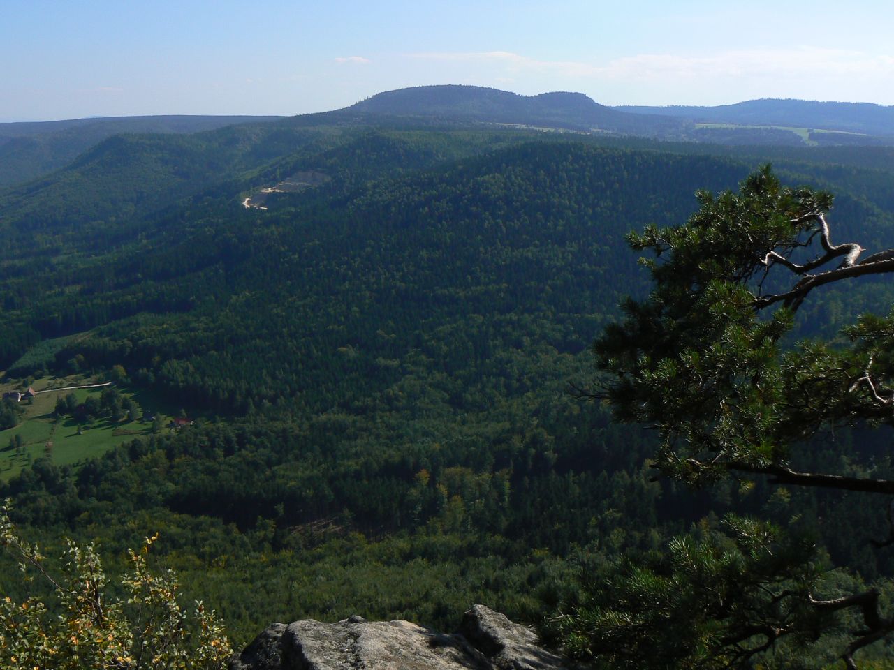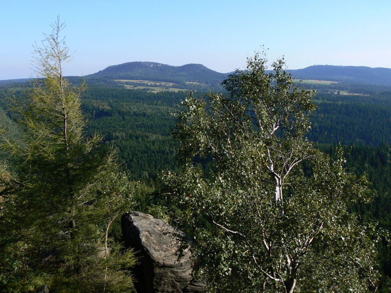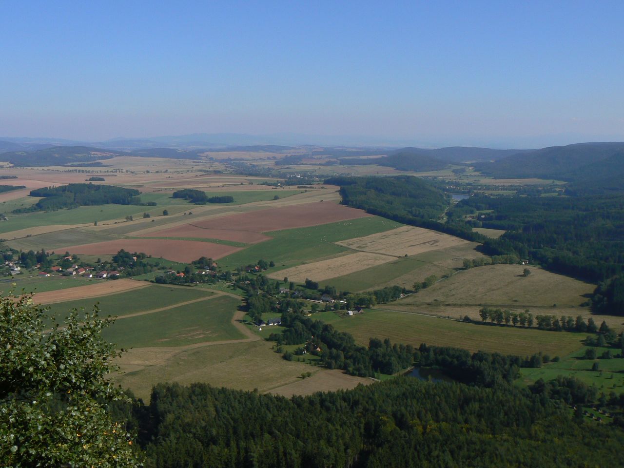 Z téhle vyhlídky je ještě krásnější výhled, než od Kamenné brány. Vidíme pod námi lesy, pole, louky a vesničky Broumovské kotliny a za ní se k nebi vypínají mnohé vrcholky sopečného pohoří jménem Javoří hory a za nimi ještě vyšší hory - Góry Kamienne s nejvyšší horou Waligórou.