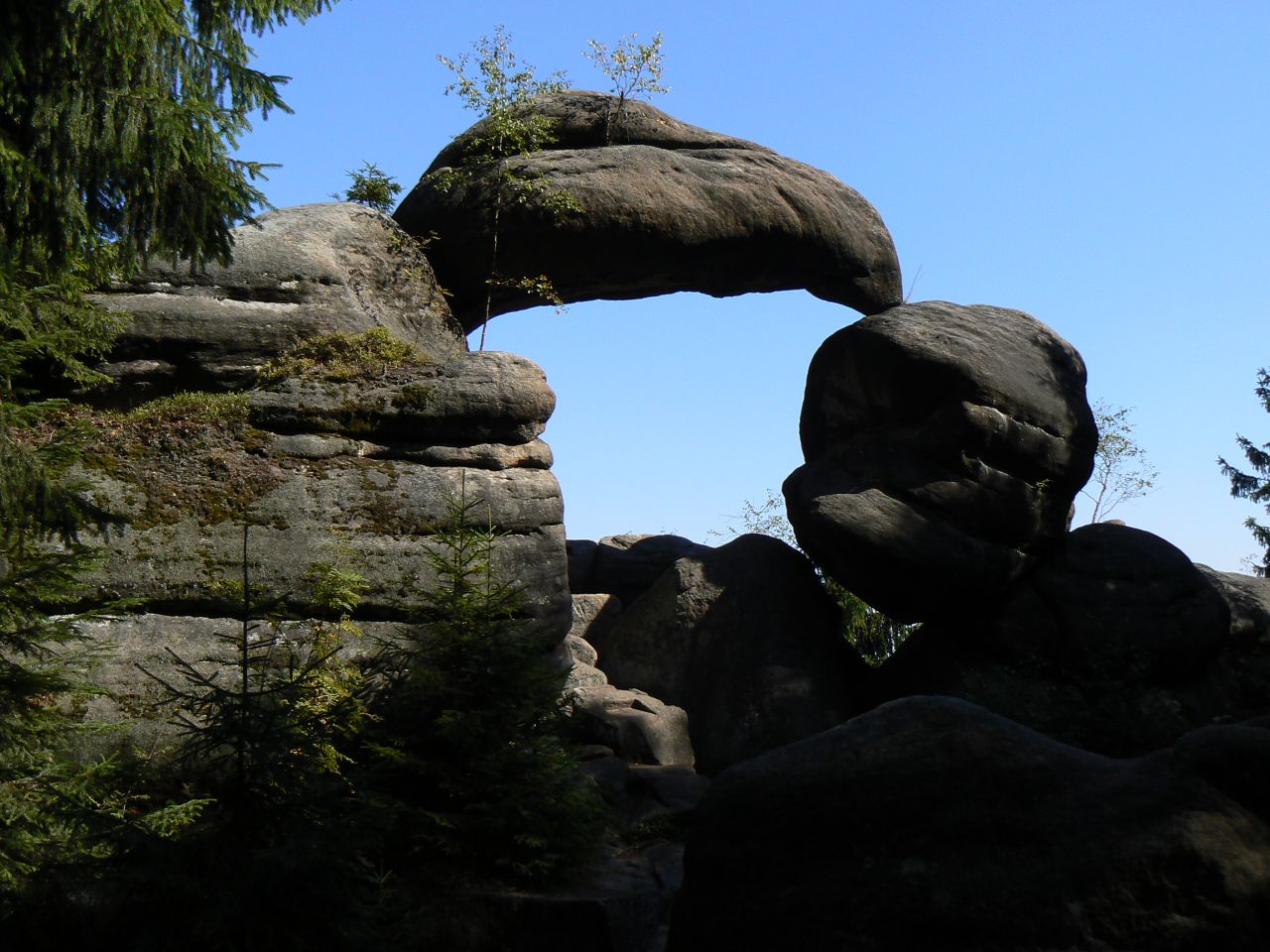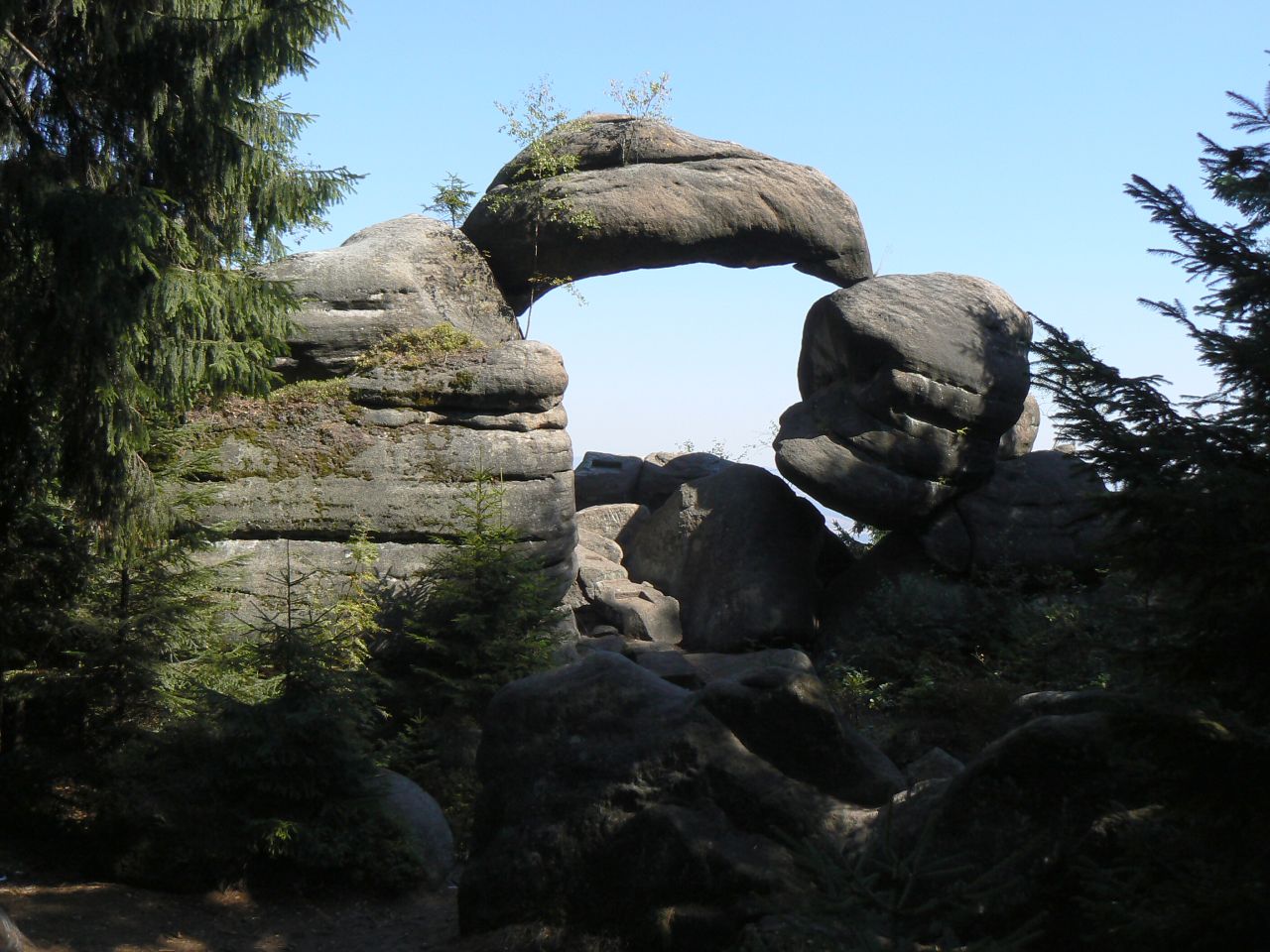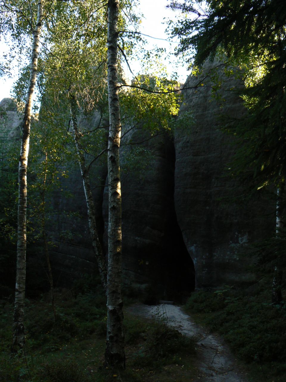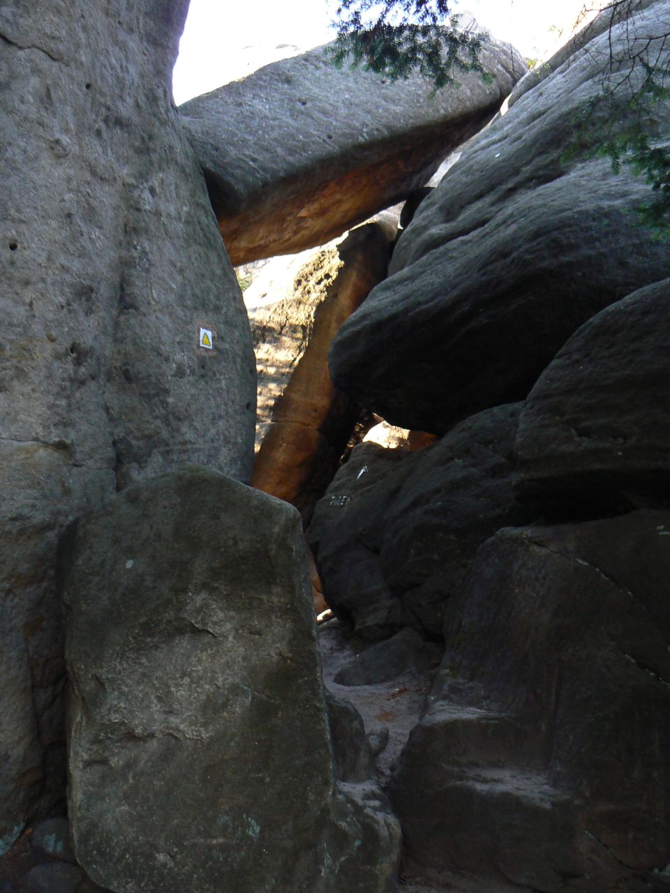 Od Pánova kříže se rozbíhají značené cesty na všechny strany. My si vybíráme značku žluté barvy, která nás chvíli vede lesem, chvíli mezi balvany a dovede nás až k monumentální skalní bráně.