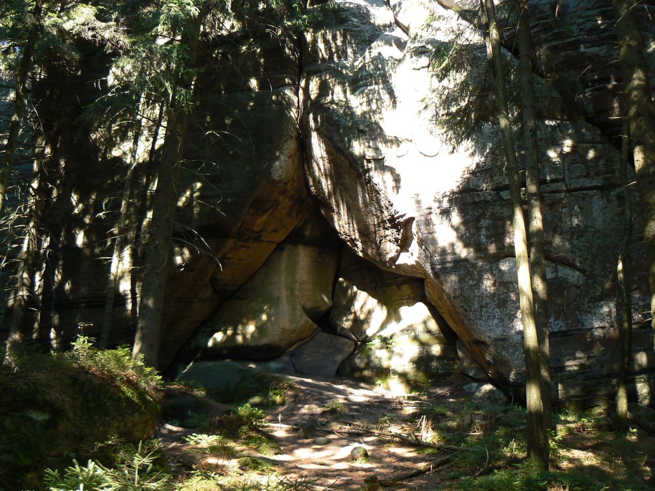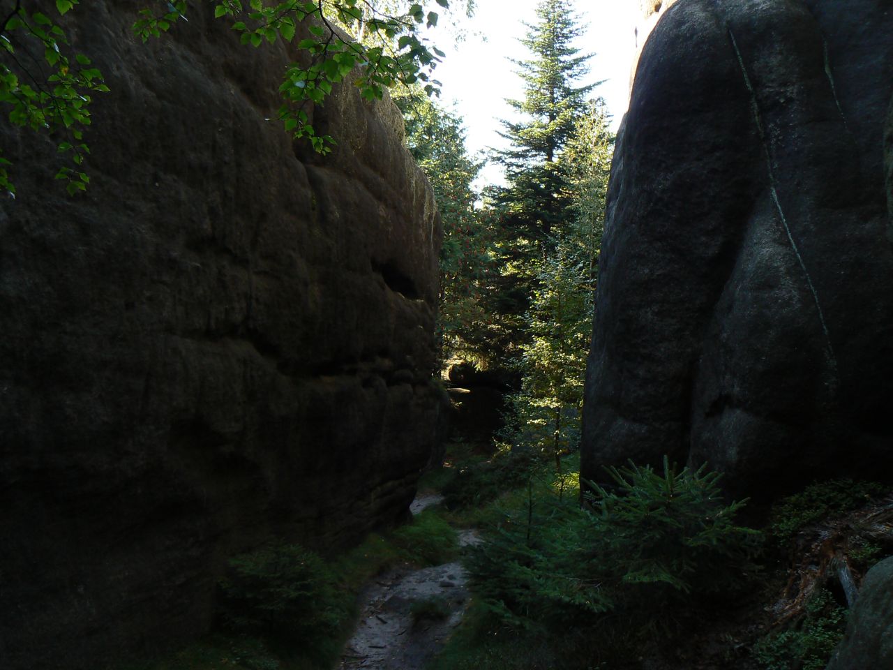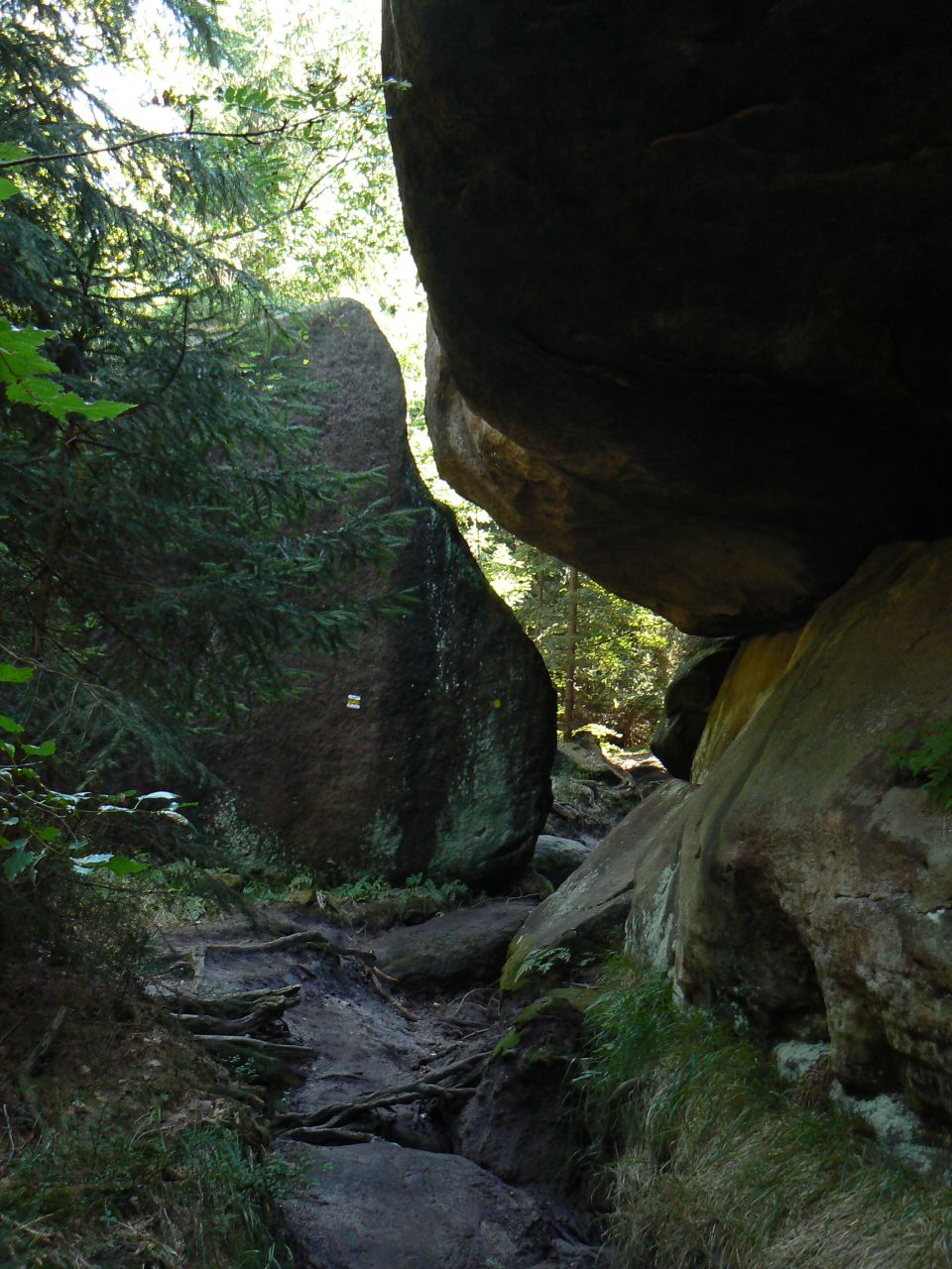 Z téhle cesty však žlutá značka po chvíli odbočuje a vede nás po úbočí, kterým pohoří Broumovských stěn prudce spadá do Broumovské kotliny. Cesta to není jednotvárná, vede nás přes další skalnatou rokli, plnou obrovských balvanů.