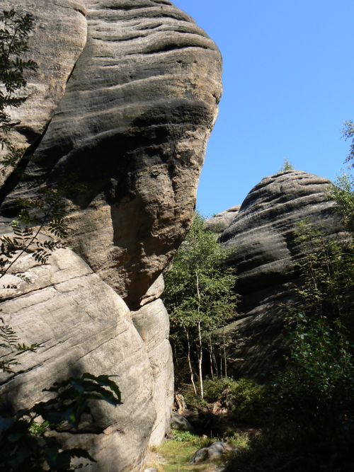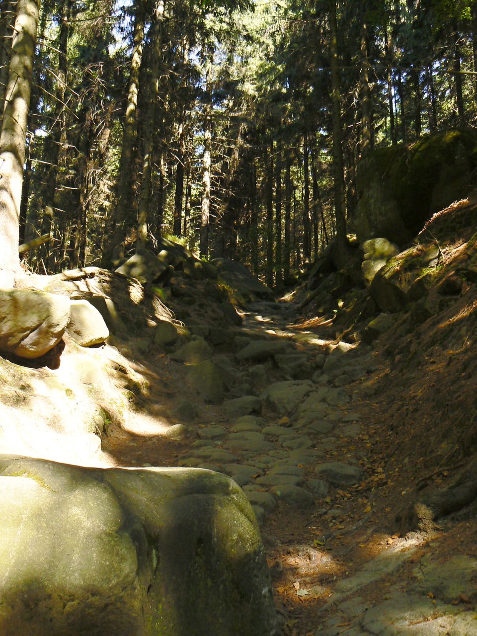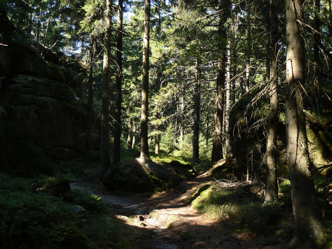 Z téhle cesty však žlutá značka po chvíli odbočuje a vede nás po úbočí, kterým pohoří Broumovských stěn prudce spadá do Broumovské kotliny. Cesta to není jednotvárná, vede nás přes další skalnatou rokli, plnou obrovských balvanů.