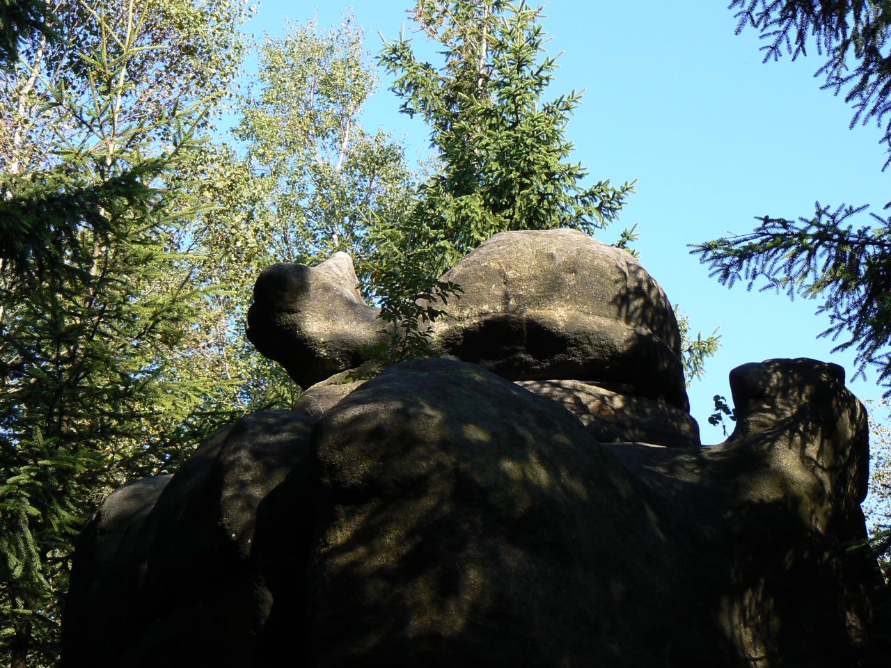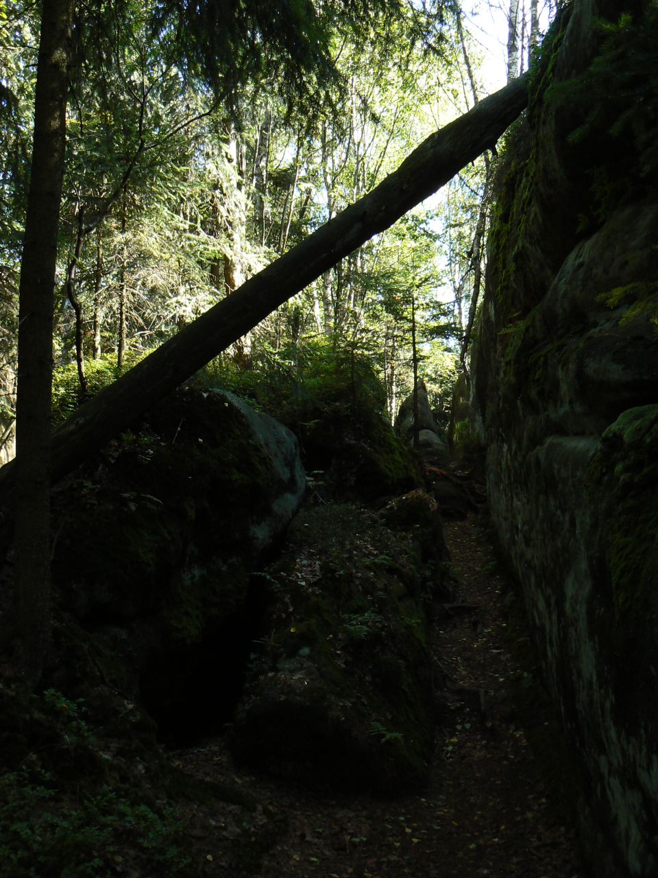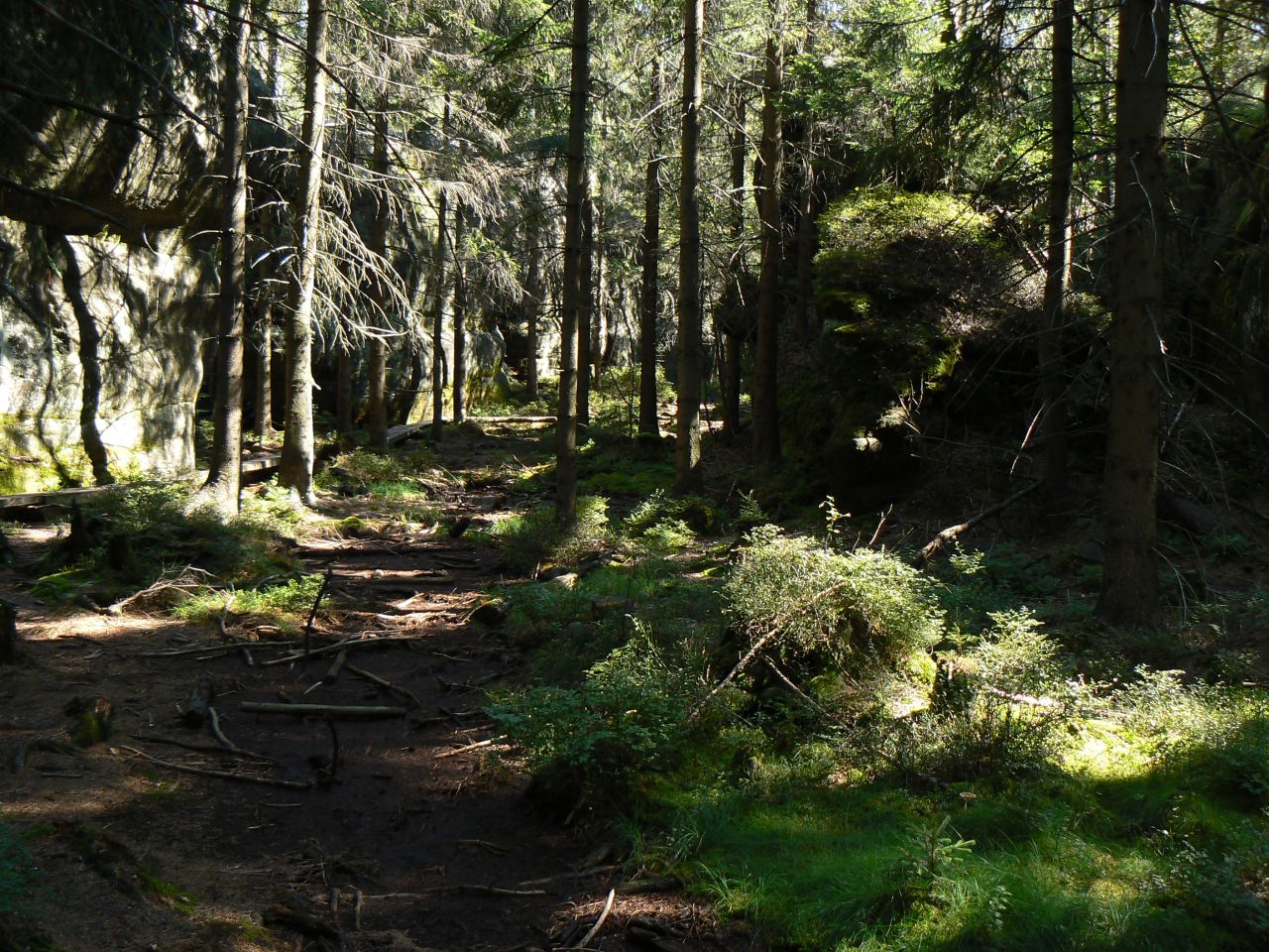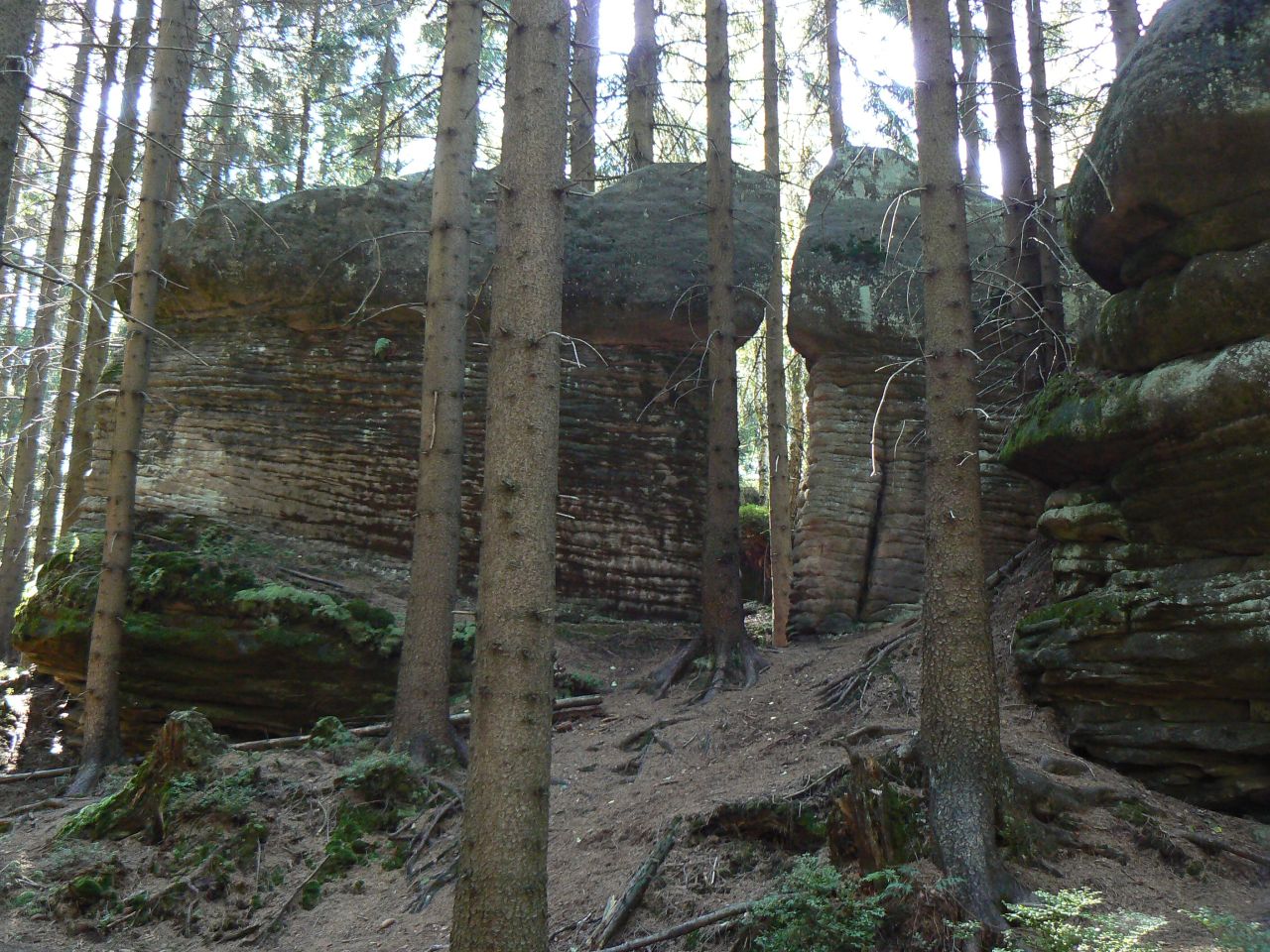 Junácká vyhlídka není jedinou zajímavostí těchto míst - pod námi se rozkládá celé skalní město, jehož částí se proplétá značená cesta jako v pravém bludišti, větší část je neznačenou divočinou, plnou skal a divokých roklí. Bohužel se sluníčko už silně kloní k západu a bylo by kruté, kdyby nás tu zastihla tma, proto se vracíme stejnou cestou k Pánovu kříži a po Vambeřické cestě se vydáváme směrem ke Slavnému. Okolo jsou jen stromy, ale cesta pěkně ubíhá. Přece jen se však jedna zajímavost najde...
