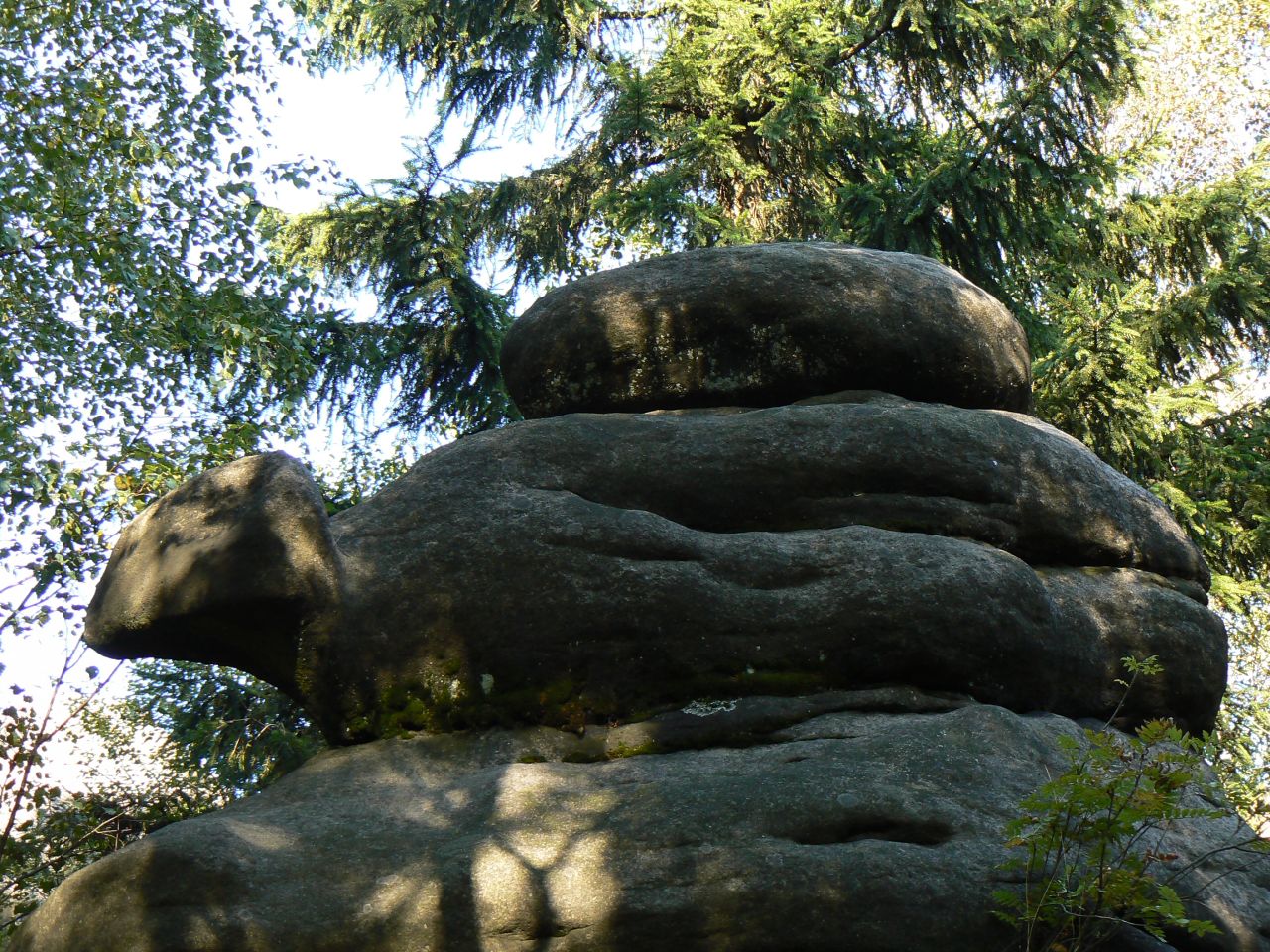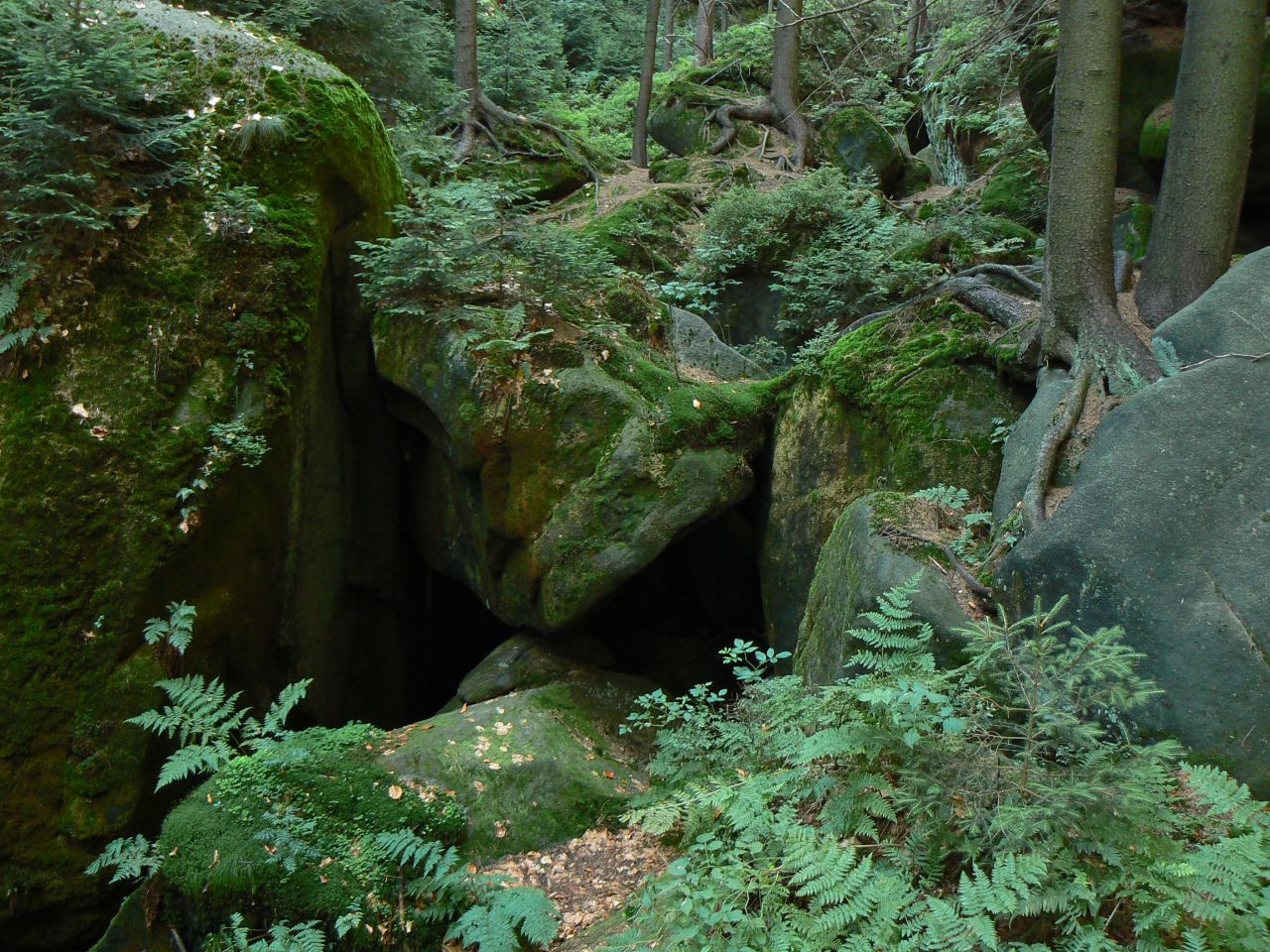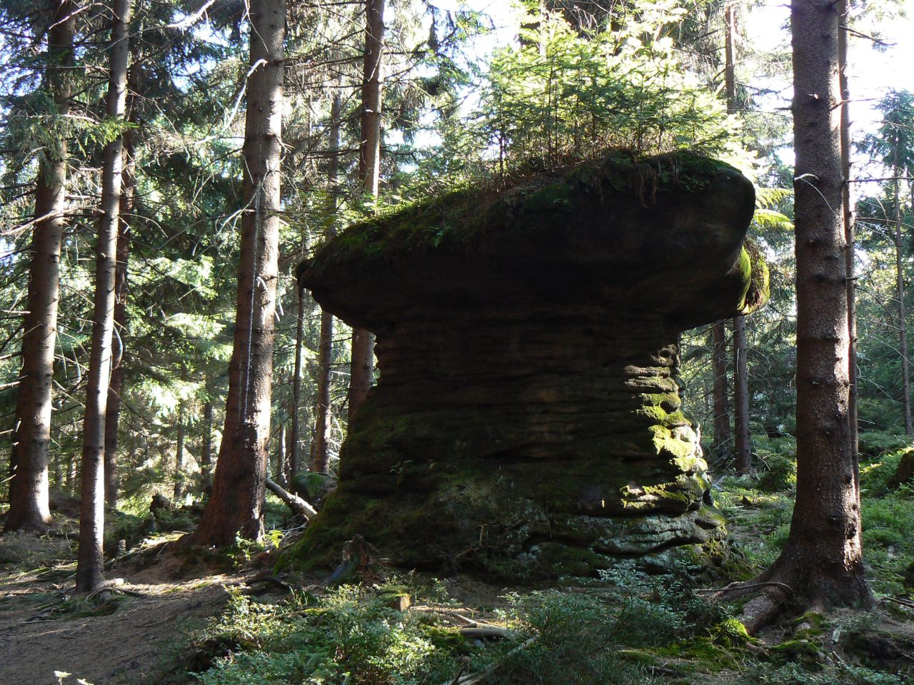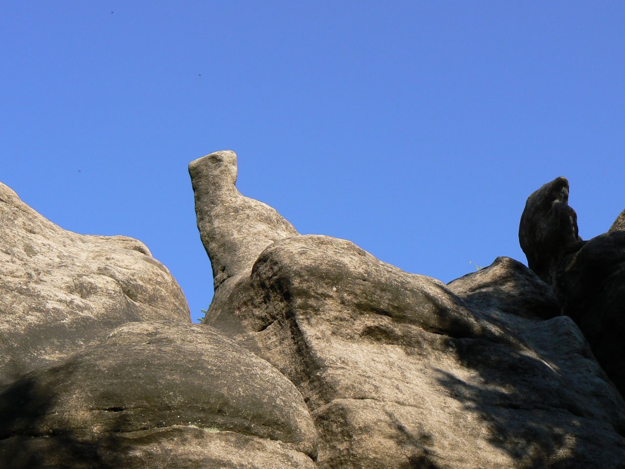Junácká vyhlídka není jedinou zajímavostí těchto míst - pod námi se rozkládá celé skalní město, jehož částí se proplétá značená cesta jako v pravém bludišti, větší část je neznačenou divočinou, plnou skal a divokých roklí. Bohužel se sluníčko už silně kloní k západu a bylo by kruté, kdyby nás tu zastihla tma, proto se vracíme stejnou cestou k Pánovu kříži a po Vambeřické cestě se vydáváme směrem ke Slavnému. Okolo jsou jen stromy, ale cesta pěkně ubíhá. Přece jen se však jedna zajímavost najde...