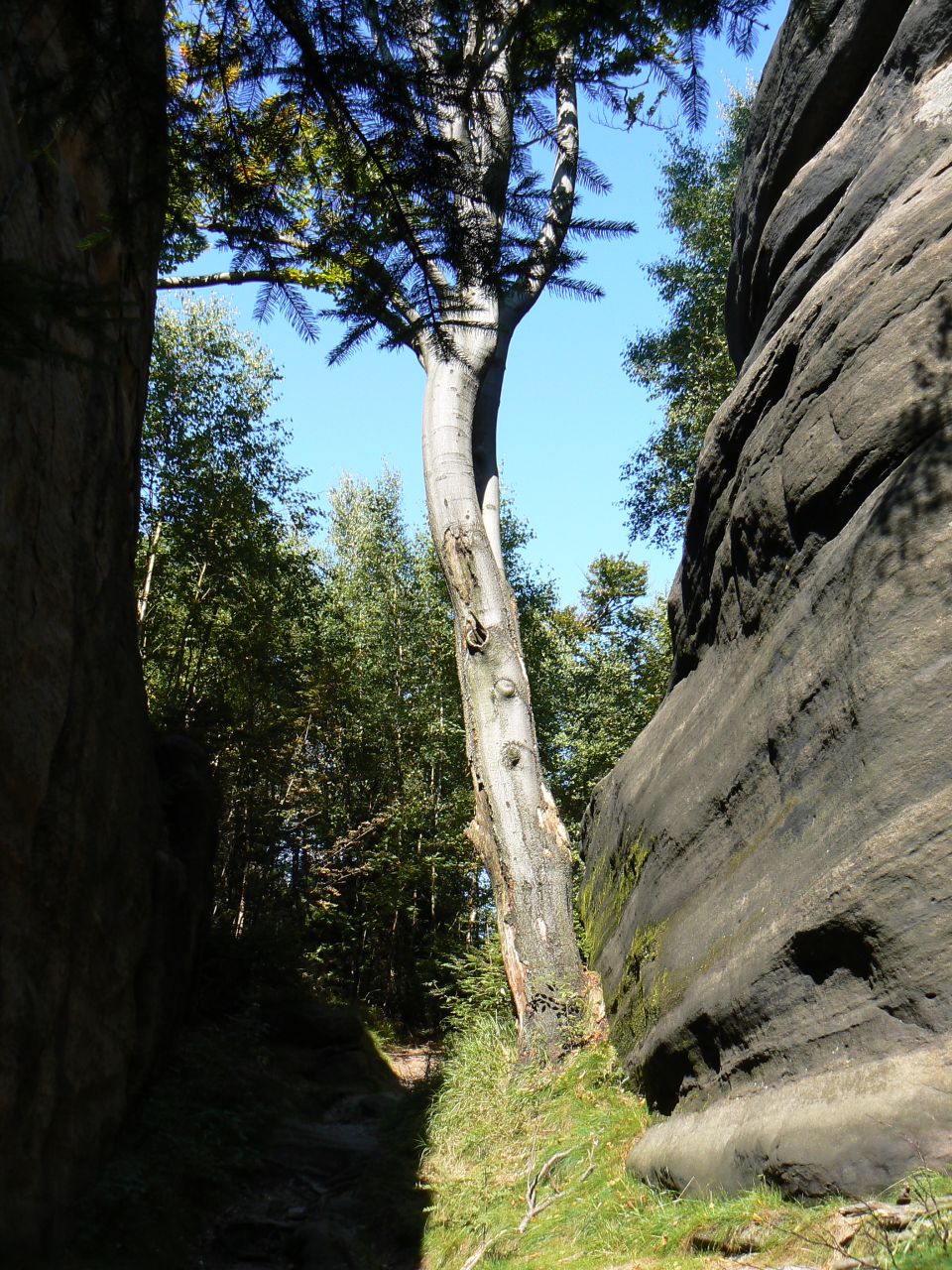 Pod kopcem narazíme na příčnou cestu, na které opustíme dolů do Božanova vedoucí žlutou značku, dáme se nalevo a po kousku cesty narazíme na zelenou. Po ní jdeme příjemnou lesní cestou a když se po naší levé straně začnou objevovat mělké skalnaté rokle a průrvy, jsme u dalšího pěkného místa Broumovských stěn - ve skalách na Božanovském Špičáku. Dorazíme tam žlutě značenou odbočkou a cesta to není vůbec nezajímavá. Není tu zpočátku tolik skal, jako třeba na Velké Kupě, ale zajímavá je každá z nich.