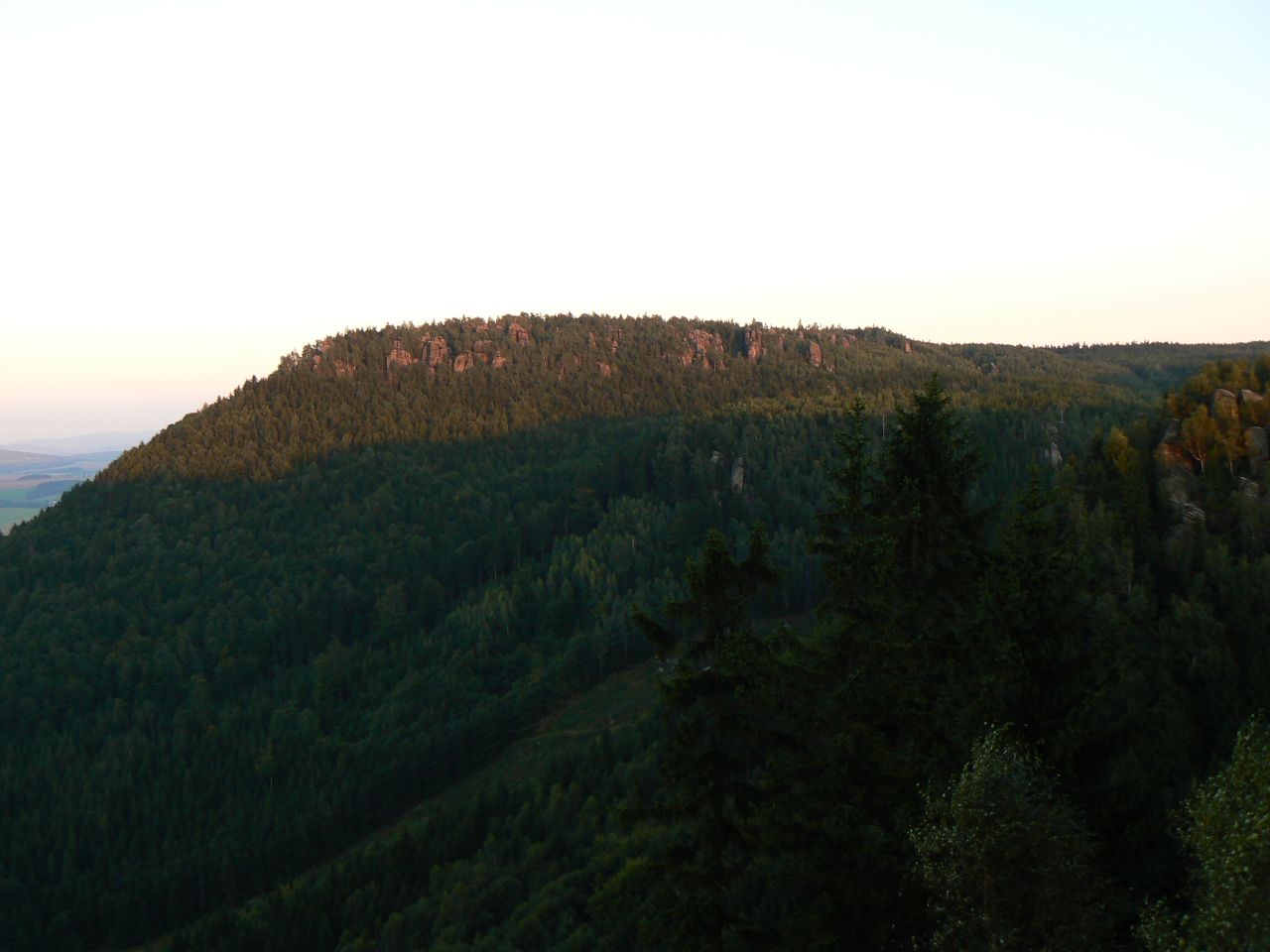 Broumovské stěny odtud vypadají nádherně. Koruna je odtud dobře vidět - jsou to ty vysoké skály napravo na hraně pohoří. Více vlevo je o metr vyšší Božanovský Špičák - nejvyšší vrchol Broumovských stěn. Vzadu vidíme celé Broumovské stěny až k Hvězdě. Splachtíme zpátky na Korunu a čeká nás táž cesta na rozcestí.