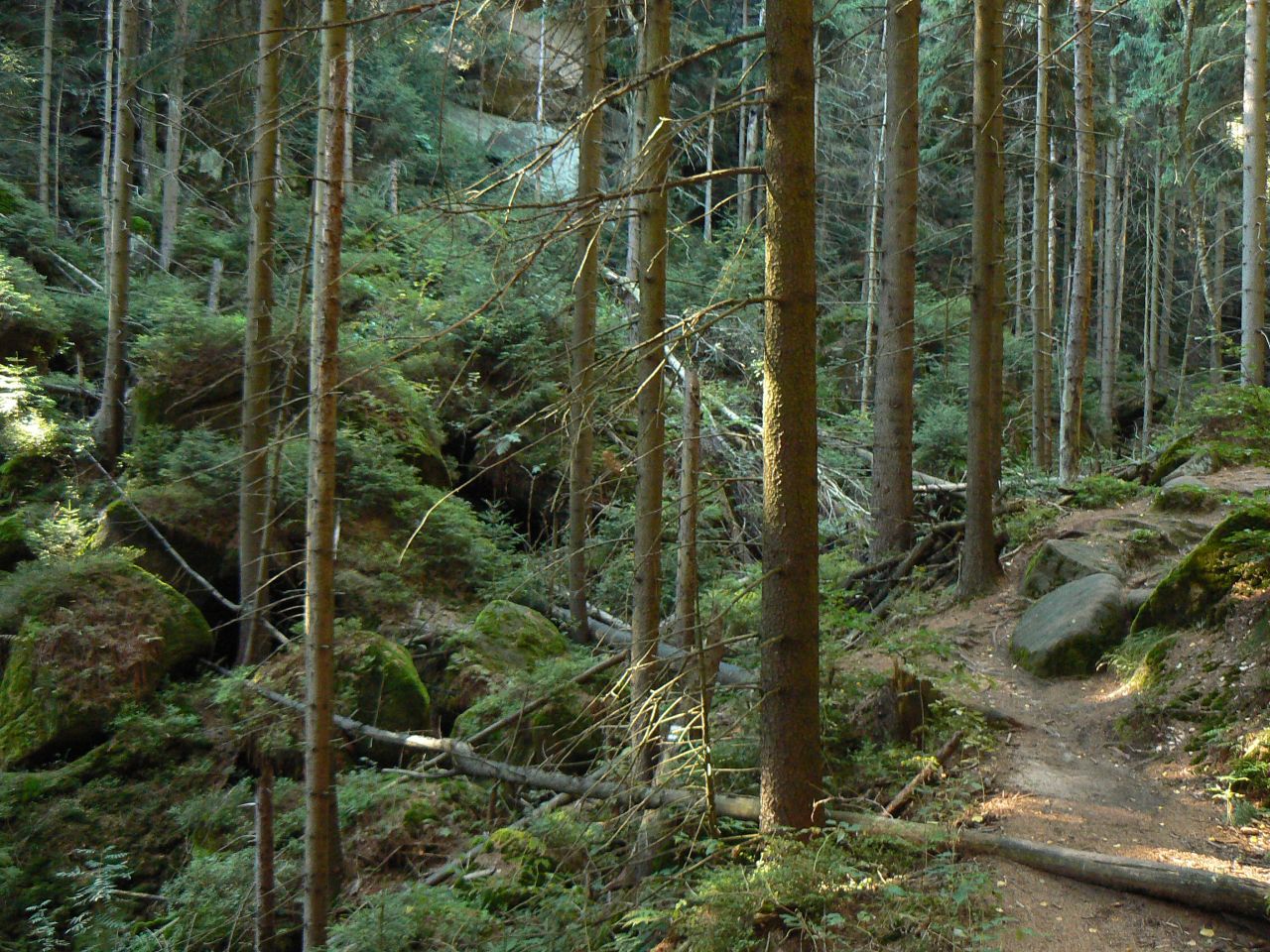 ...po pěšině, které po chvíli začíná prudce sestupovat do hluboké Zaječí rokle. Za chvíli už jsme v pravé divočině, plné omechovatělých balvanů a živých nebo mrtvých a různě popadaných stromů.