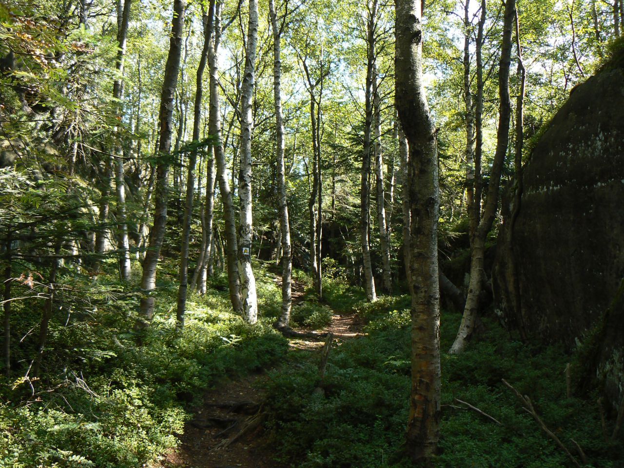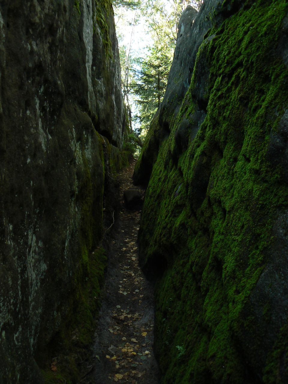 Cesta se odklání od hrany vrchu, ale nuda nám tu nehrozí, protože se vzápětí hrouží mezi docela vysoké skály.