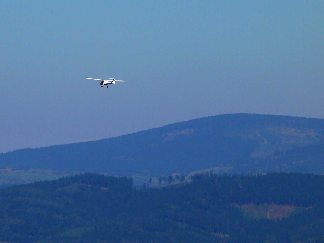 Zajímavé věci tu však máme i téměř na dosah - krásné skály, všelijak pokroucené borovice... ale také naši pozornost upoutá stále hlasitější vrčení a po chvíli kolem nás neuvěřitelně blízko proletí pěkné malé bílé letadélko, jehož pasažéři nám z okének mávají. Bohužel bylo letadélko rychlé a můj foťáček pomalý - než se zaktivoval, bylo letadélko pryč.