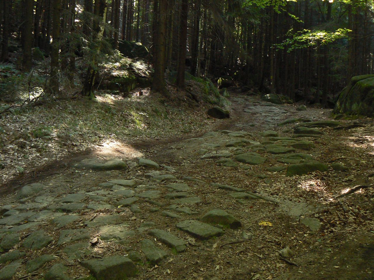 Cesta Vodní zámky je krásná, vede mezi skalami a obrovskými balvany a je dlážděná velkými kameny, místy nepravidelnými, místy obdelníkovými, poskládanými podobně vázaně, jako se skládají stěny z cihel. Někde se dláždění zachovalo, jinde ho už dávno voda podemlela a všelijak zprohýbala. Cyklisté tak mají co dělat, aby prokličkovali všemi nástrahami, které jim prudký sjezd touhle cestou přináší. Snažíme se jim nepřekážet, ale příjemný pocit to není, obzvlášť když se cesta zúžuje a není se moc kam uhnout. Cyklisté jsou naštěstí přívětiví a ohleduplní a snaží se, aby svou jízdou neohrožovali sebe ani druhé. Jen jednou se ve mně zastaví srdce, když jednomu závodníkovi kousek nad námi podjede kolo a on sebou praští rovnou na kostrbaté kameny. Naštěstí to asi znamenalo jen pár modřin, hned se zvedá a pokračuje v jízdě.