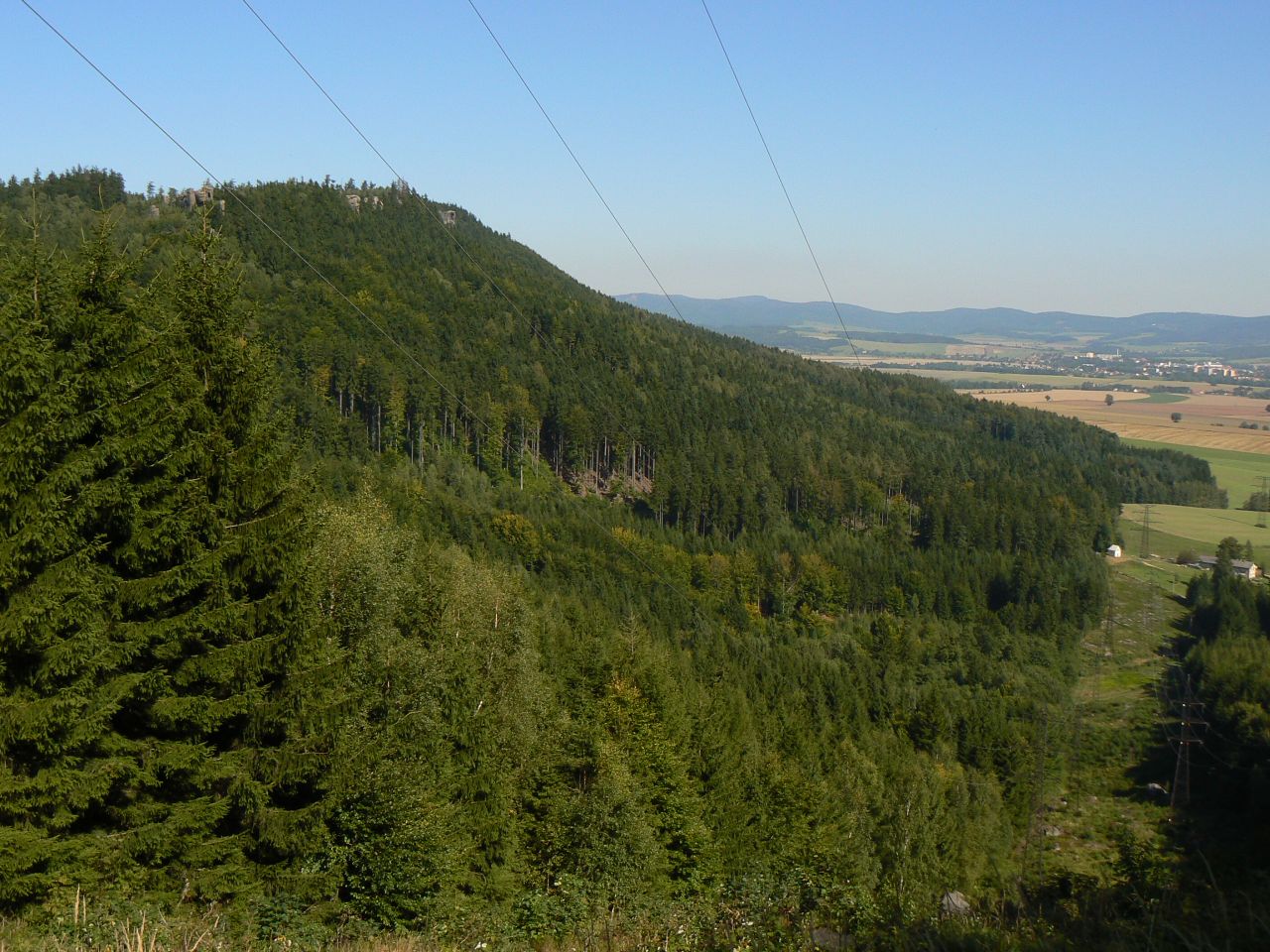 Průsek, v němž stojí mohutné sloupy vedení vysokého napětí, odhaluje výhled na skály nad námi, Broumovskou kotlinu i Javoří hory.