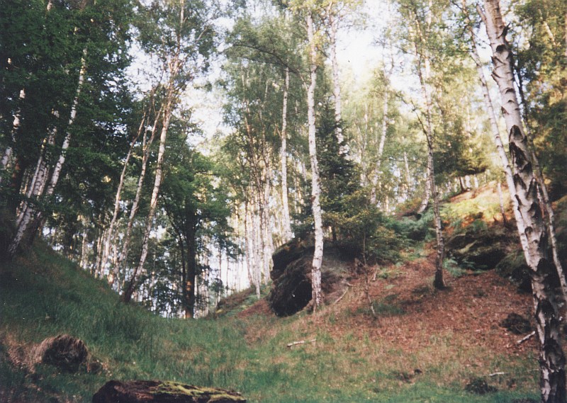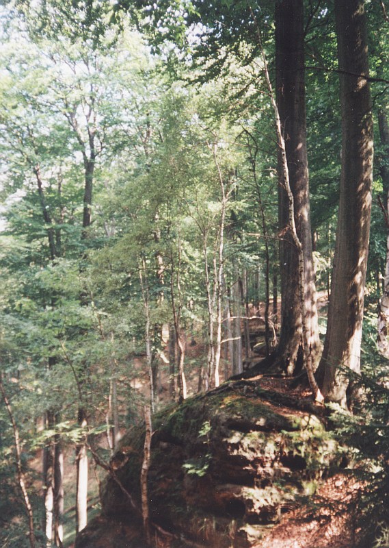 nic nebrání.Nad Máchovým jezerem se vypíná několik výrazných vrchů. Jedním z nich je i Borný - stoupání na něj je sice prudké, ale nahoře čeká odměna v podobě pěkného výhledu na Máchovo jezero. Když se za Borným vydáte směrem pryč od Máchova jezera a přejdete hlavní silnici, octnete se v krásném smrkovo-bukovém lese na úpatí Polomených hor. Širokou cestou zvanou Nová cesta stoupáme do mírného kopce. Je ale potřeba vzít s sebou dobrou mapu - jednak můj popis cesty není zdaleka dokonalý, jednak je tu cest hodně a bez mapy je problém najít tu pravou. Okolo cesty se již začínají místy objevovat skály, ale ty nejkrásnější to prozatím zdaleka nejsou.